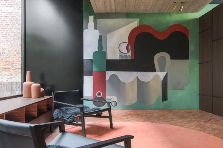 Voor het interieur boden de landelijke omgeving en de context van de ouderlijke landbouwerswoning de nodige inspiratie. Dat vertaalt zich in een uitgesproken atypische, eerder brutalistische inrichting, die haaks staat op wat klanten traditioneel vragen. Wengé-hout voor de wanden, rosso persiano natuursteen - in visgraatmotief - voor de vloer en beton voor het plafond zijn de dragers van de interieurafwerking. De houten, geprofileerde kastenwand is vernuftig functioneel. Ze verenigt opbergruimte, een keuken, een toilet, een bed – voor klanten die blijven overnachten na een avondlijke bespreking -, een doucheruimte. Het ter plaatse gestorte plafond meet zich de schuine belijning aan van de gesprekstafel. Het bandraam boven de kastenwand en de glazen wand naar de patio geven het plafond een zwevend effect. Het bandraam zorgt voor extra sfeer wanneer het de avondzon binnen haalt. Ronde kokers in het plafond van de kast brengen daglicht tot op het toilet. De brede houten vensterbank aan het grote raam vormt een interessante zitplek. Het meubilair in het paviljoen is afgestemd op de basiskleur van de vloer.