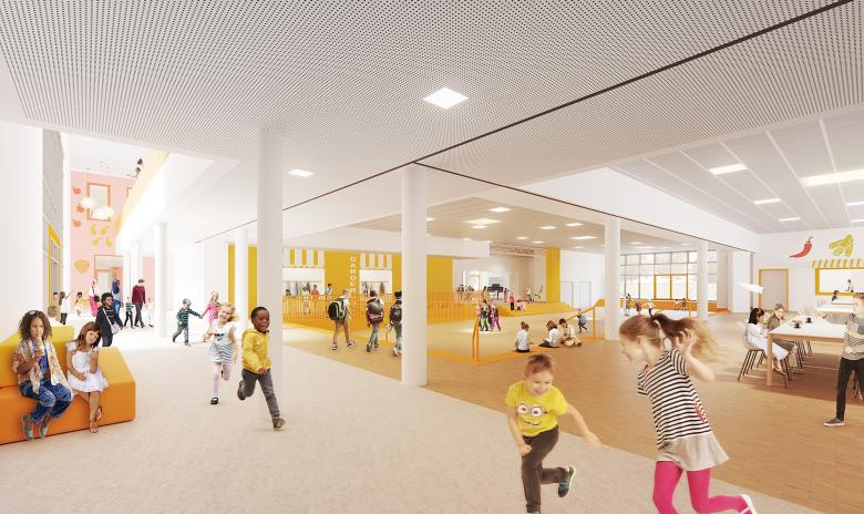 Der Stadtteil Mühlenberg im Süden Hannovers erhält mit dem Ersatzneubau der Grundschule ein zentrales Bildungs- und Gemeinschaftszentrum. Der Entwurf greift die kulturelle Vielfalt des Stadtteils auf und schafft einen interkulturellen Marktplatz als Ort der Begegnung. Dieser neue Begegnungsort stärkt die bestehenden Qualitäten der Umgebung und schafft einen geschützten und gleichzeitig offenen Raum, der die interkulturelle und inklusive Ausrichtung der Schule symbolisiert.