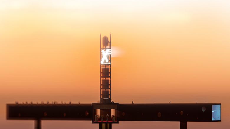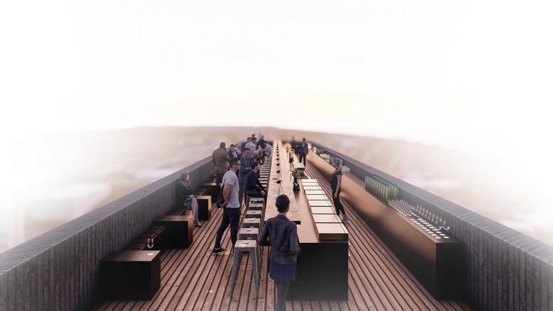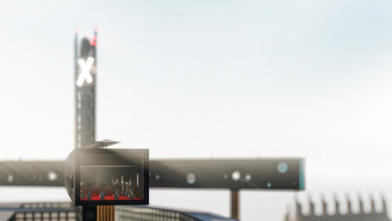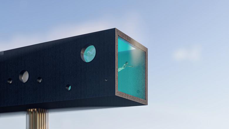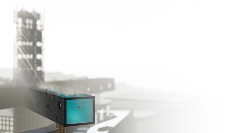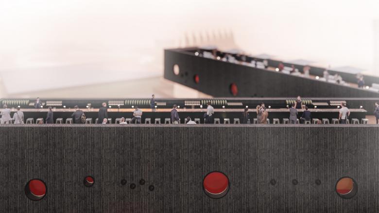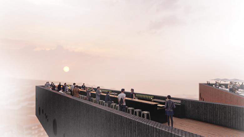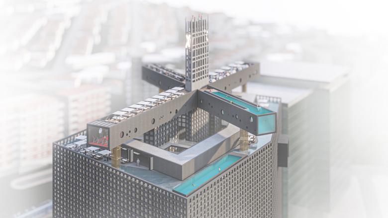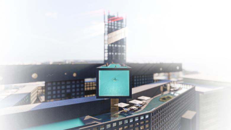 The morphology of our building takes shape around the setbacks and height restrictions dictated by the authorities. The deep slabs of the base accommodate flexible retail space along with carefully planned public pedestrian circulation, private residential cores and vehicular ramps. Above those are the modularly office units, which also occupy the relatively deep slabs of the structure. The higher plateaus in which the residential and hotel components are disposed around an eight stories high internal void / courtyard, which includes the hotel sky lobby. Above the body of the building, an X shaped bridge houses a gym / spa, and a sky bar / lounge on its roof. This “crown” exceeds the 50 meters height restriction and is given a special approval by the municipal authorities, which consider it an exceptional urban destination that will positively animate the urban fabric. The tip of the facades of the roof installation feature oversized frames / windows providing spectacular views of Pristina. Each frame pointing towards one of the preferred orientations celebrates each of the activities performed inside, such as the 5 x 5 meters aquarium like frame pointing east, behind which swimmers can be seen in floatation animating the skyline of the city.