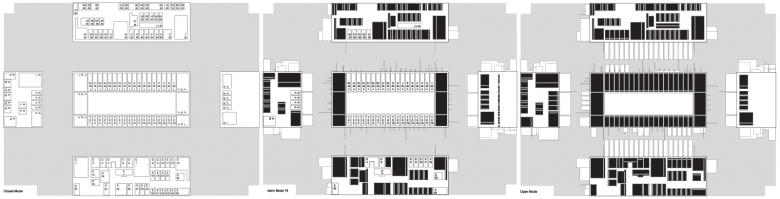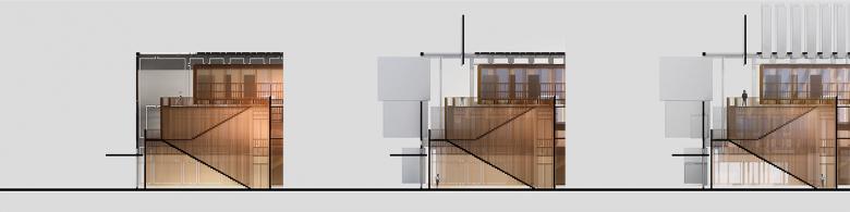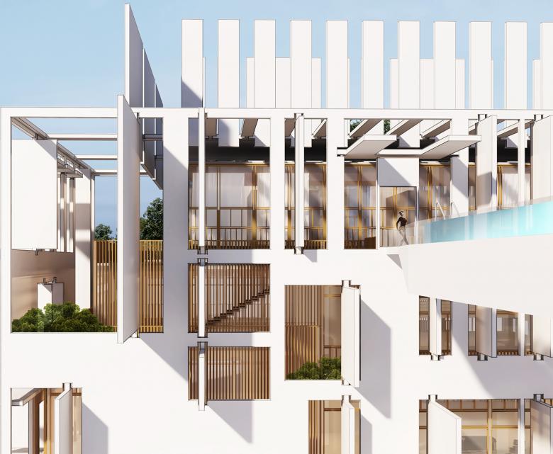 The conception of the envelope adds another layer of complexity to the project. The outer skin consists of a smooth white surface punctured by a matrix of hinged openings of variable size. In contrast, the interior skin is translated as an intricate system of brass-finished extruded aluminum profiles that articulate openings, windows, and outdoor passageways. The outer skin is able to completely shut off the residence from its context. It also opens up to allow its users to see and be seen with a full sense of control on the desired frames one would like to expose or not. An exquisite condition is created in the superimposition of a voluntary neutrality on the outside and a precious materiality on the inside. This duality also creates unique in-between spaces of being outdoors and indoors, private and exposed, all at once.