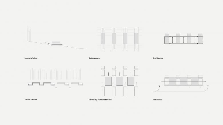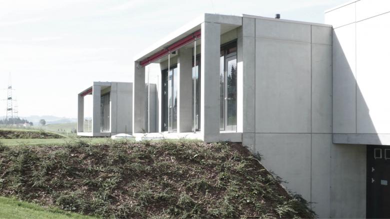 Die plastische Baukörperformulierung mit Vor- und Rücksprüngen trägt zum kleinteiligen Erscheinungsbild ebenso bei wie der differenzierte Diagonalrythmus zwischen verglasten und geschlossenen Fassadenflächen bei den Längsansichten. Während sich die `Spuren` mit der Topographie verzahnen, fließt das Gelände praktisch natürlich durch die Hallenbereiche hindurch. Die monolithische Materialisierung aus kerngedämmten Stahlbetonfertigteilen lässt das Gesamtensemble wie einen Findling in der Landschaft erscheinen.