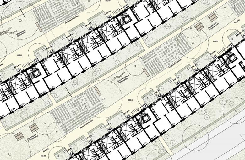 Teile der bestehenden Wohnhäusern aus den 1940er-Jahren sollen im Rahmen einer Verdichtung ersetzt werden. Die lockere Anordnung von Zeilen aus Einzelbauten formen im Bestand weitläufige Zwischenräume die teils als private Gärten, teils als gemeinsam bewirtschaftete Flächen genutzt werden. Nachbarschaftlichkeit misst sich hier am Bodenkontakt sowie am Umgang mit gemeinsamer und individueller Infrastruktur. Freistehende Häuser auf privaten Grundstücken zeichnen die umliegenden Stadtbereiche aus. Die kleinteiligen Gartenräume und Parzellenstrukturen charakterisieren ruhige Wohnstrassen. Diese vielfältige Lebenswelt wird mit den vorgeschlagenen Ersatzbauten in eine zeitgemässe und verdichtete Wohnform überführt. Reihenhäuser und Geschosswohnungen fügen sich zu einem hybriden Ganzen, das sich in die lockere Bebauung der Gartenstadt einfügt und einen grossen Reichtum an Wohnformen und Aussenbezügen schafft. Die vorgeschlagenen Neubauten schreiben so die vorgefundene Zeilenstruktur weiter und bilden gemeinsam mit der mittleren Gebäudereihe zwei Wohnstrassen.