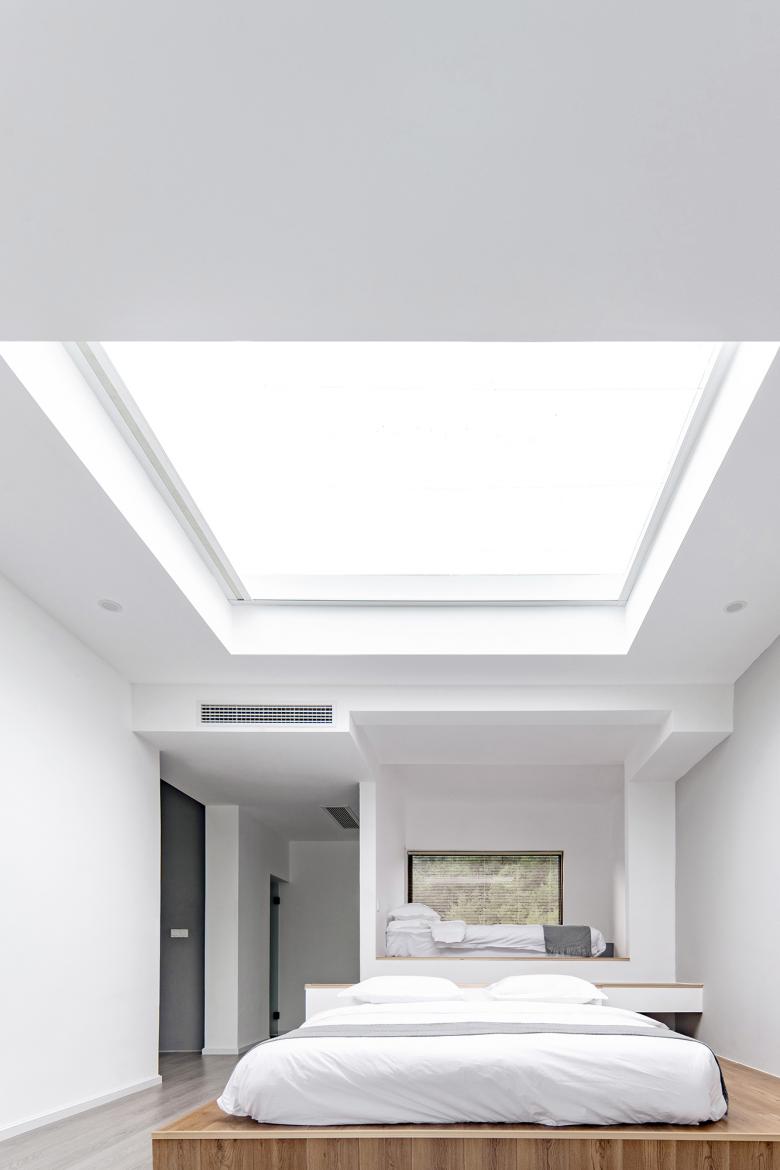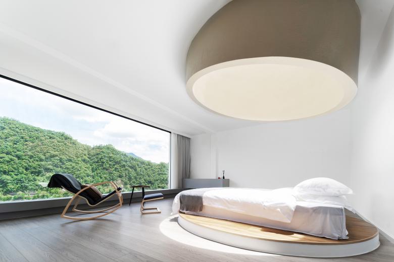 窗,几乎是整个设计中最重要的议题:建筑、内部空间与外部环境,在这一元素上产生交汇,很大程度上决定了建筑的形神与功能分布:我们希望迈入每个房间,都有扑面而来的自然风景。开窗的位置、尺寸、朝向均取决于面前的风景,每扇窗都是一个取景器,最大程度将山、水和天空引入室内,也被我们戏称作所谓的“顺其自然”。设计一面在不断强调“窗”这一元素的重要性,而另一方面希望尽可能削弱它的存在感,我们希望“窗”本身(窗框、玻璃、接缝)是不被感知的。因此,细节处理上,尽可能透过视线组织,利用结构、窗帘、平台等要素的遮挡弱化窗框与分缝,使其“不存在”。