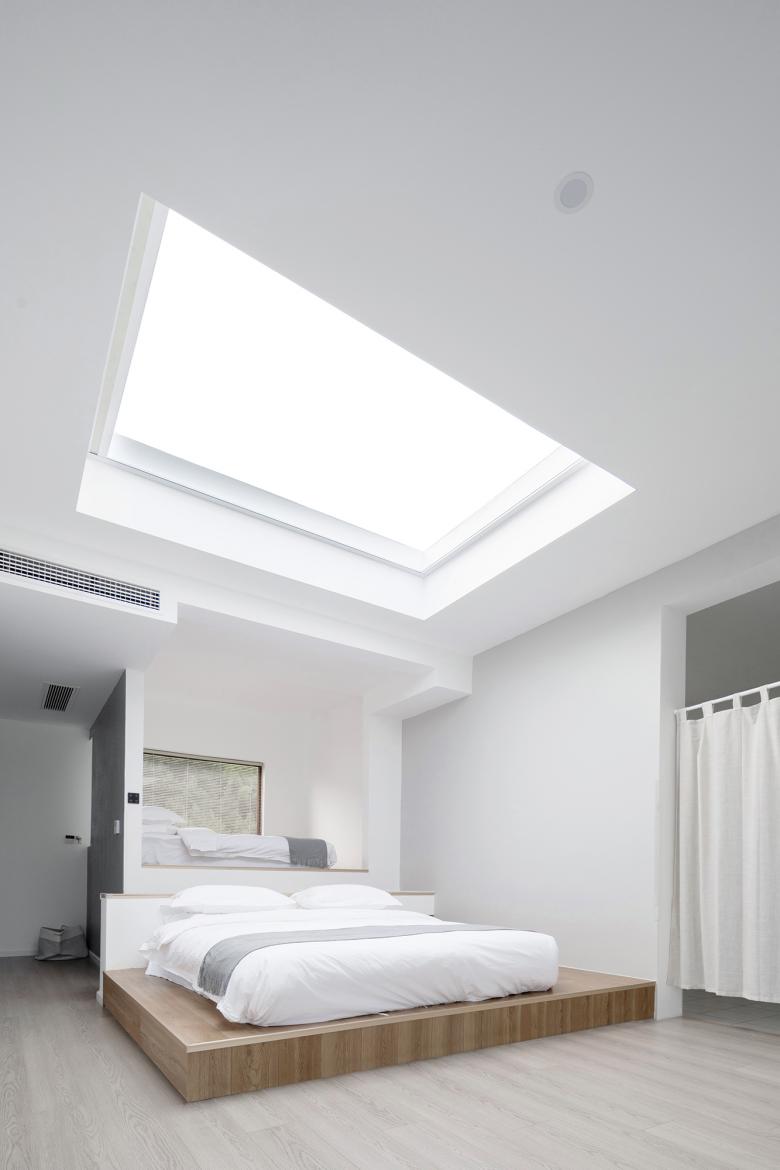 三层建筑中共有包含7种不同类型的15个客房,以满足包括亲子、家庭、情侣、老年人在内的多组不同客群、不同人数的空间需求。空间不论选材或造型都追求以“轻”为主。墙面多为质朴的肌理涂料,局部结合榆木、夯土漆等交代功能节点。家具造型也追求简洁与纯粹的几何构成美感。