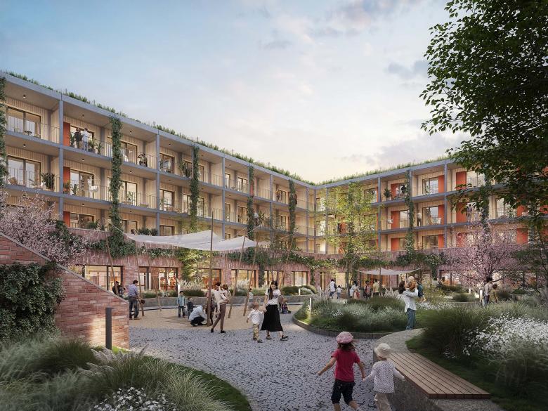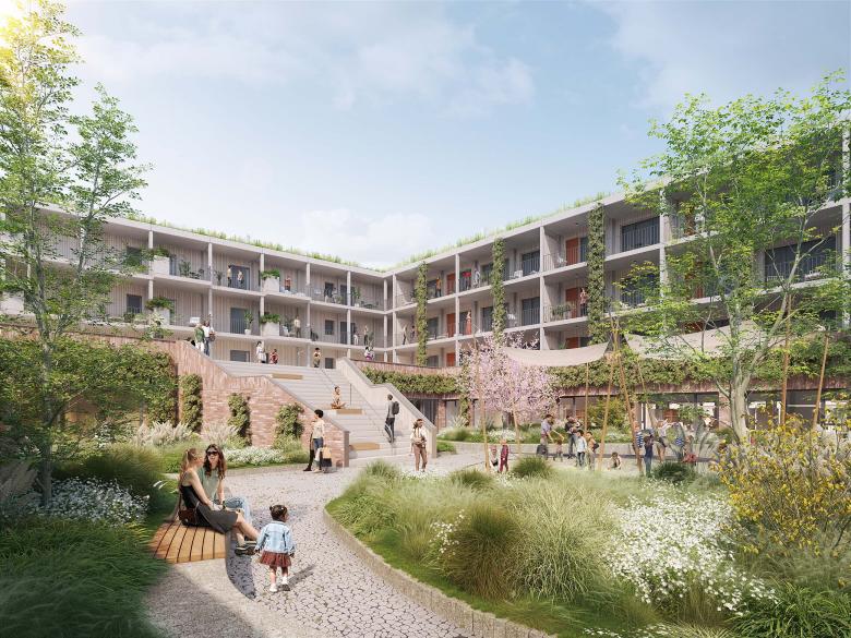 Grundlage der Planungen bildet die Sanierung und Transformation des vorhandenen denkmalgeschützten Karstadt-Altbaus (1) von 1922 und seinem großen Anbau mit Parkdeck (2) aus den 1960er Jahren. Während die historische Tuffstein-Fassade des Altbaus auch weiterhin das Stadtbild prägen wird, erhält der Anbau – durch Nutzungsmix, Aufstockung, Innenhof und Ergänzungsbau - eine neue Bestimmung und ein verändertes Aussehen. Dank des vorhandenen Stahlbetontragwerks und Ergänzungen in Holzhybridbauweise, kann der Umbau wirtschaftlich umgesetzt werden. Anstelle des ehemaligen Parkhauses (3), entsteht ein neues Wohngebäude, sodass im gesamten Quartier circa 125 bezahlbare Wohnungen angeboten werden können.