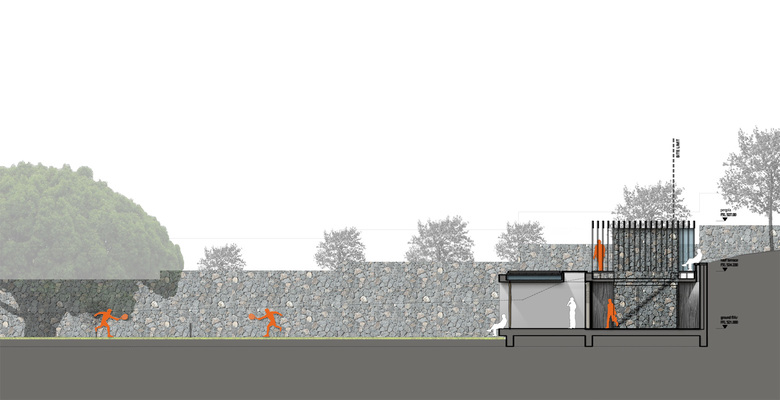 A private sports pavilion on a north-facing sloped site in Floreal, central Mauritius; the pavilion is conceived as a long open concrete tube with the accommodation of office, dining, study and lounge set along a terrace that runs the full length of the tube facing the tennis court and gardens. A light wood and glass pergola is placed on top of the tube to create a shaded roof terrace with views over the mountains and a connection to a small golf practice area to the south. A simple, economic and unembellished palette of materials is employed to reinforce the concept of the sports pavilion. Board marked concrete, kiatt wood screens and sliding glass screens allow the building rooms to fully open and close to the exterior as required. A skylight extends the full length of the closed side of the pavilion illuminating a stone wall and drawing light and ventilation into the deep section of the pavilion.
