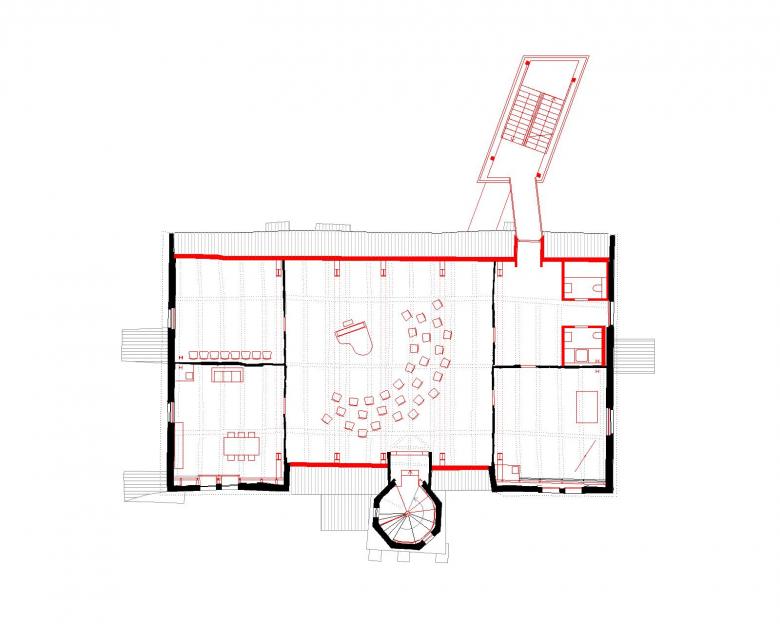 Deutlichster Eingriff jedoch ist die Errichtung eines externen Treppenturmes, der sich markant hinter dem Bauwerk erhebt, als wolle er einen stabilisierenden Anker für den sich nach vorn neigenden, historischen Schlossturm bilden. Die mit karbonisiertem Holz verkleidete Stahlkonstruktion schließt als sichtbar zeitgenössisches Element an das Schloss an und stellt mit seiner rauen, rußigen Oberfläche ein eher dem angrenzenden Wald zugewandtes Pendant zur strahlend weißen Putzfassade dar.