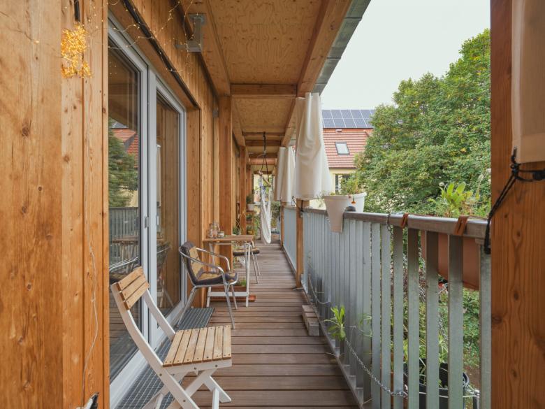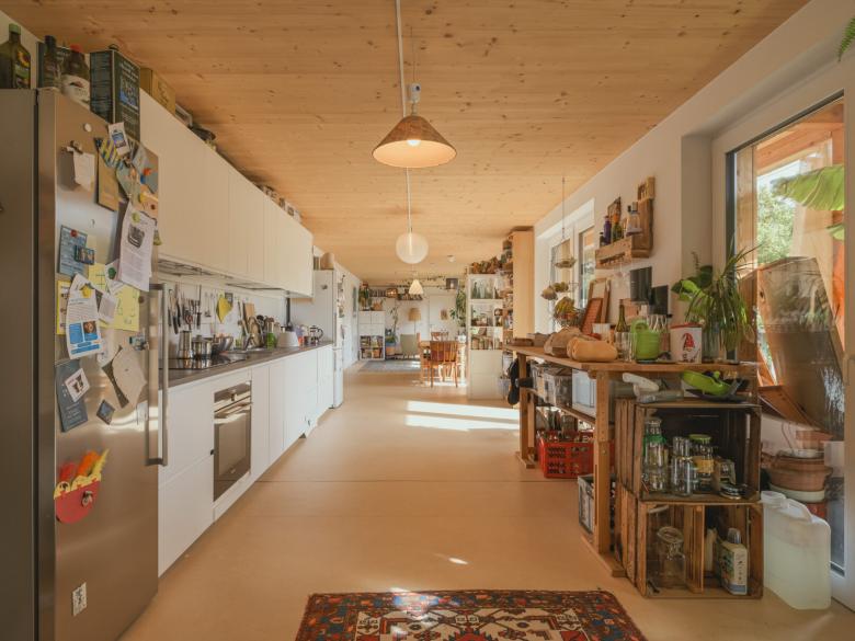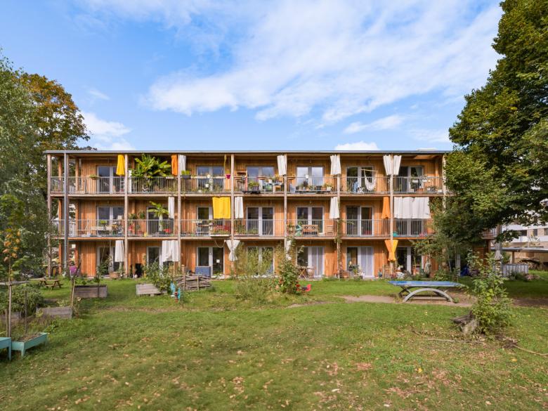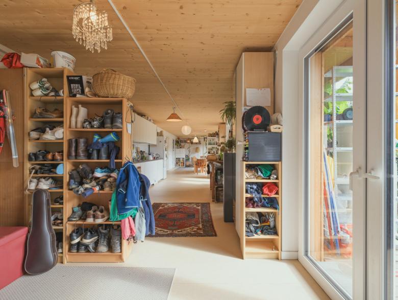 Der Grundriss des Gebäudes besteht auf jedem Stockwerk aus einzelnen Clustern, die unterschiedlich stark autonom sind. Einzelne Cluster sind mit eigenem Bad ausgestattet, andere nicht – diese teilen sich ein Bad mit einem weiteren Cluster. Auf jedem Stockwerk teilen sich die Bewohnenden einen großen Gemeinschaftsraum zusammen mit einer Gemeinschaftsküche. Es entsteht ein Mix aus privaten Rückzugsräumen in den einzelnen Clustern und einer großzügig geschnittenen Gemeinschaftsfläche. Hier wird eine bestmögliche Umsetzung der Idee eines Zusammenlebens vieler Menschen auf wenig Raum angestrebt. Die Begegnungsfläche lädt zum regelmäßigen Austausch ein und macht ein gemeinschaftliches Leben möglich, bei dem etwa Carearbeit zusammen gestaltet und geteilt werden kann.