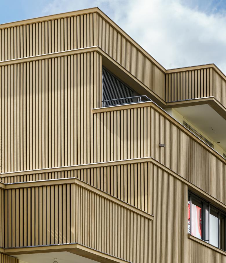 Die typische 70er Jahre-Fassade, materialisiert mit vorgehängten Waschbetonelementen und orangefarbenen Metallflächen, war praktisch unisoliert und sollte einen zeitgemässeren Ausdruck erhalten. Eine Überdämmung der Waschbetonplatten hätte zu unangenehm tiefen Fensterleibungen und geringeren Verglasungsflächen geführt. Die neue Holzfassade erinnert in ihrer Tektonik an das Prinzip der ursprünglichen Elementfassade. Die glatte Holzverkleidung unterstreicht dabei die tragende Funktion der darunterliegenden Ortbetonstütze. Das lamellierte Füllelement erklärt die vorgehängte, nichttragende Funktion. Die edelstahlbedeckten Holzsimse schützen und gliedern die Elemente. Die mit Schlammfarbe lasierte Schweizer Weisstanne ist langlebig und erzeugt ein attraktives Fassadenkleid ohne Vergrauung. Balkon-/Laubengang-Einschnitte und Attika-Rücksprünge schneiden als weisse «Weichteile» in die Volumetrie ein. Damit der Zugangshof heller, und der Blick auf die umliegenden Fassaden frei wird, wurde das Glasdach vom dunklen Gitterrost befreit.