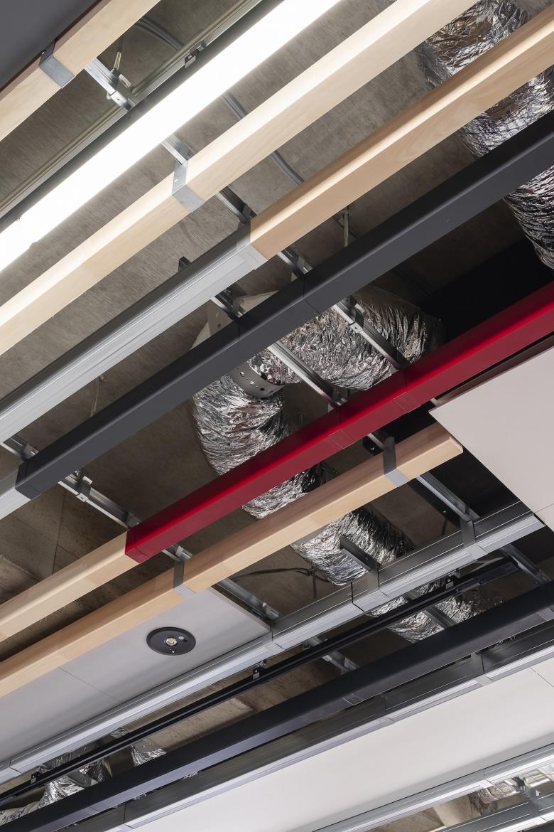 The ceiling houses essential systems such as air conditioning, ventilation, lighting, fire safety, and communication infrastructure, all of which require updating more frequently than the ceiling itself requires new finishing. While these updates often involve removing or reapplying finishing materials, the joists (the structural framework of the ceiling) in this design are exposed and painted in random colors, while ceiling panels are limited to specific areas. This approach allows the ceiling to evolve with each update— much like the floor—resulting in a design that is dynamic and fluid.