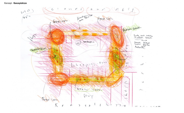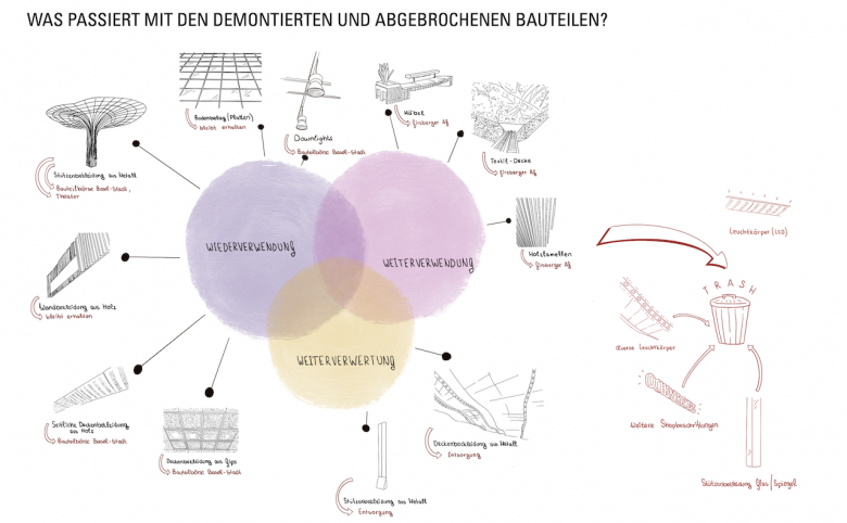Das Einkaufszentrum wird künftig als Bauteillager genutzt im Sinne eines Cradle-to-Cradle-Prinzips. Dabei werden sowohl die bestehenden als auch die neuen Bauteile unter Berücksichtigung dieses nachhaltigen Konzepts verwendet. Jedes Bauteil katalogisiert und erfasst. Wir stehen in engem Kontakt mit der Bauteilbörse Basel sowie mit Zirkular, um die nachhaltige Wiederverwendung und den Austausch von Bauteilen zu fördern. Zudem haben wir kleine Unternehmen wie OFF-CUT Basel sowie ein Theater kontaktiert, um Dekorationen wie die Metallbäume oder das Textil, das als Wand- und Deckenbekleidung im Einkaufszentrum verwendet wurde, weiterzuverkaufen oder als Kulisse für ein Theaterstück zu nutzen.