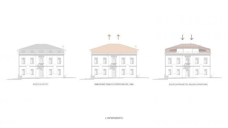 Il progetto propone un’architettura chiara ed essenziale, che esalta le qualita? spaziali dell’edificio. Il solaio e la copertura del secondo livello in calcestruzzo (ampliamento eseguito negli anni ’60) verranno demoliti, ricostruiti e riconfigurati con una struttura piu? leggera in acciaio: il volume sommitale riproposto sara? rivestito in lamiera aggraffata tinta brunita, per innescare un dialogo tra la contemporaneita? e la preesistenza. Viene proposta una terrazza ricavata scavando il volume del secondo livello e della copertura, un belvedere che inquadra il paesaggio del Monte Grappa e la magnifica Villa Piovene. Questo spazio puo? diventare uno dei luoghi cardine del territorio, un vero spazio di qualita? per i cittadini. Il sistema delle forometrie sul prospetto ovest, viene riequilibrato per recuperare una composizione piu? ordinata e simile all’originale. Per quanto riguarda le finiture interne si prevede l’uso di materiali legati alla tradizione (pietra di Vicenza al piano primo e legno all’ultimo piano per le pavimentazioni interne) e reinterpretati secondo canoni contemporanei (rivestimento esterno del volume secondo piano/copertura e infissi in lamiera aggraffata preverniciata con finitura brunita.