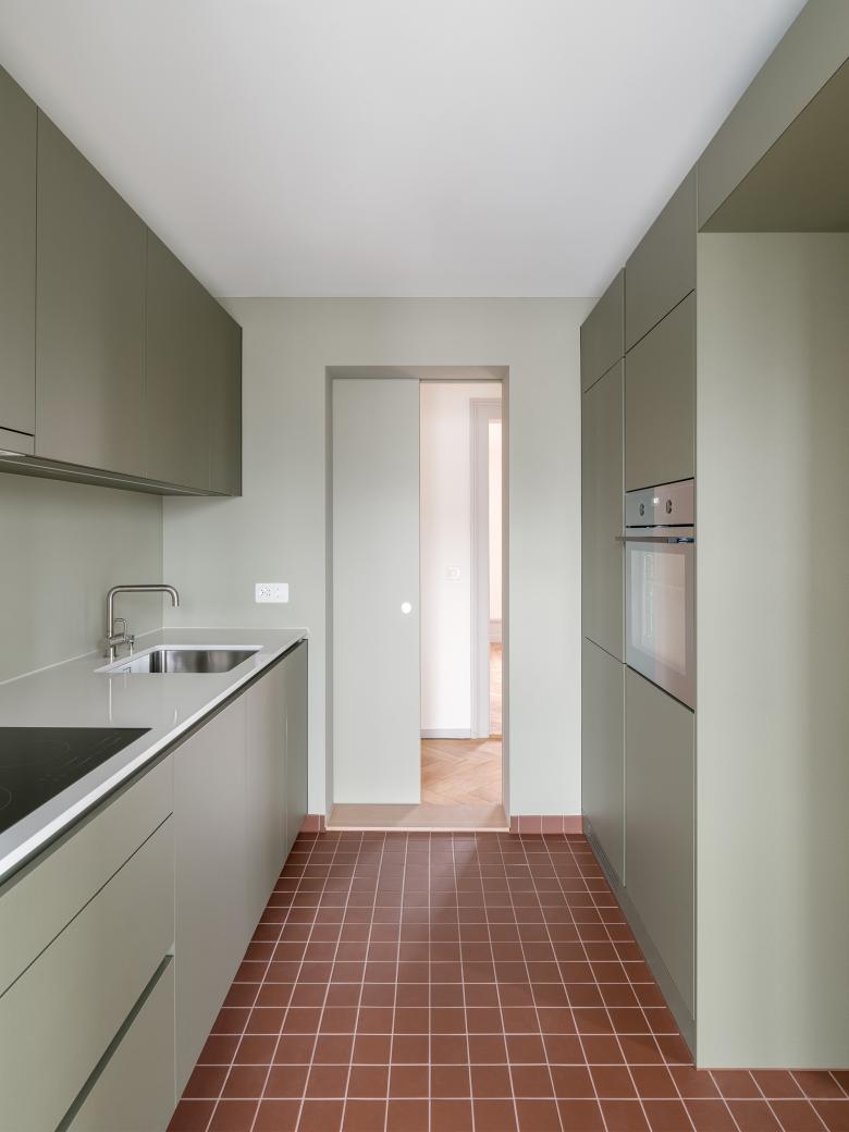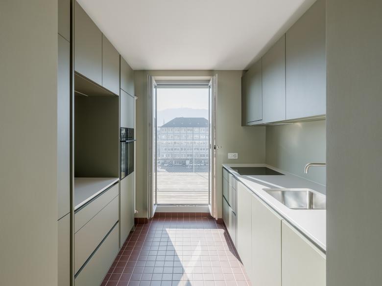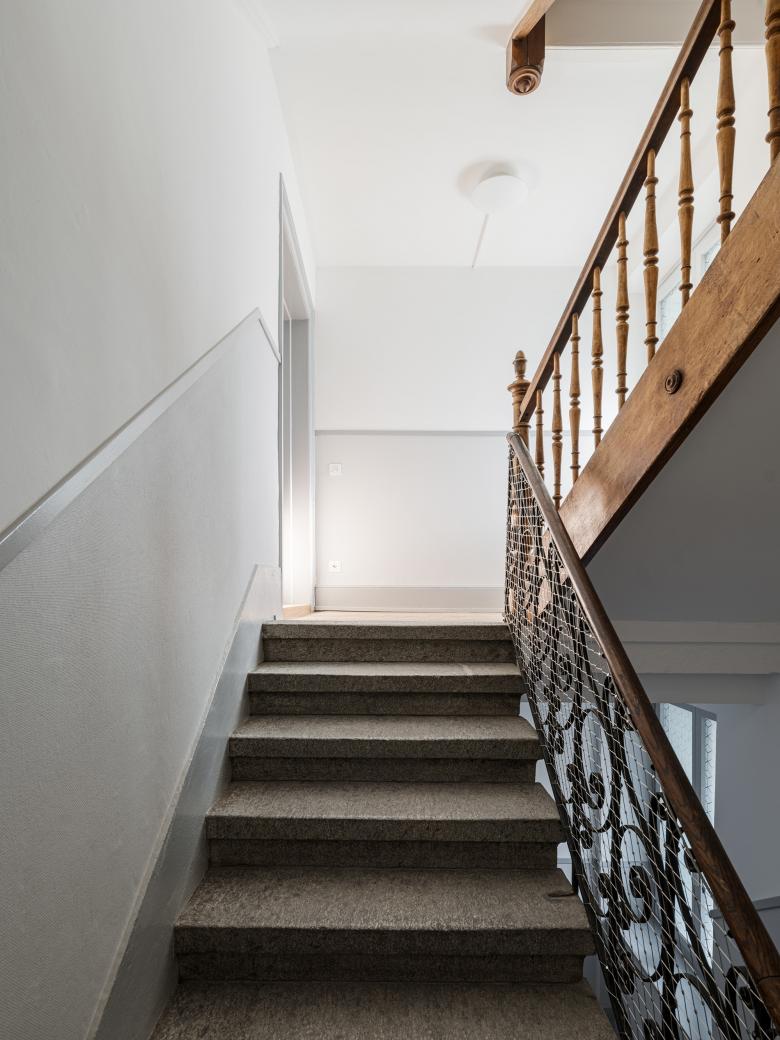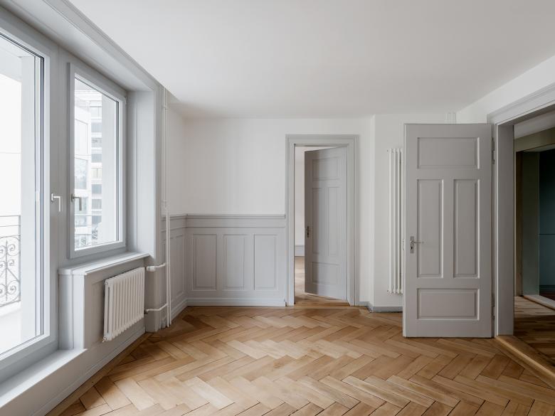 Die Atmosphäre der Wohnungen ist durch das Zusammenspiel zwischen der einfachen, minimalistischen Form- und Materialsprache der neuen Elemente und jener der Gründerzeit geprägt. Dabei wurden die kräftigen Grün- und Rottöne der Bestandsfassaden aufgegriffen und in den neuen Schreinereinbauten sowie den Oberflächen in Küche und Bad in zarten Nuancen integriert. Die Zimmer mit teilweise bauzeitlichen Fischgrat-Parkettböden und Täfern wurden zurückhaltend in Weiss und Lichtgrau gestaltet und die Patina an den historischen Oberflächen im Treppenhaus sowie an den Böden gewollt sicht- und spürbar gelassen. Aussen setzt sich die selbsttragende Erker-Konstruktion aus Sichtbeton mit seiner rohen Materialität von der reichen Ausgestaltung des Bestands ab.