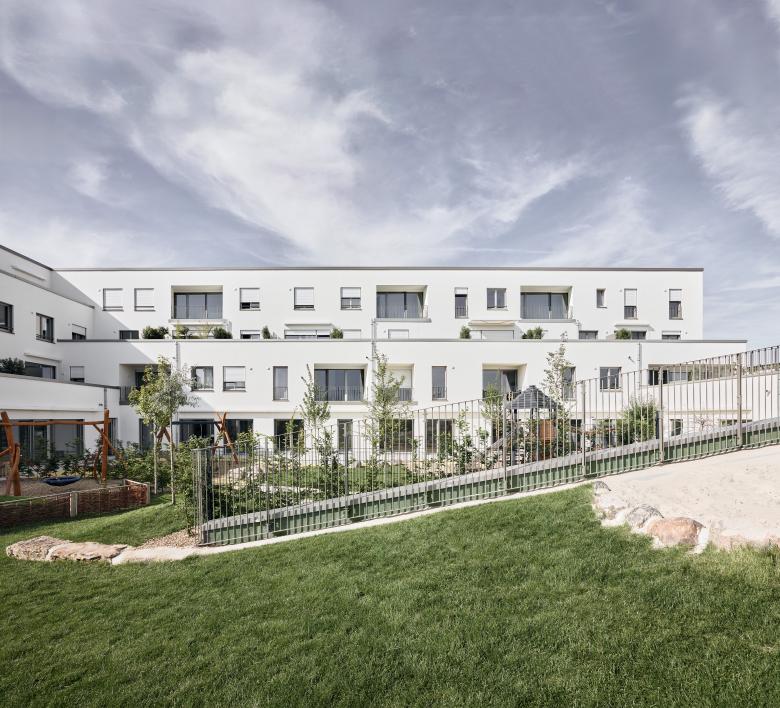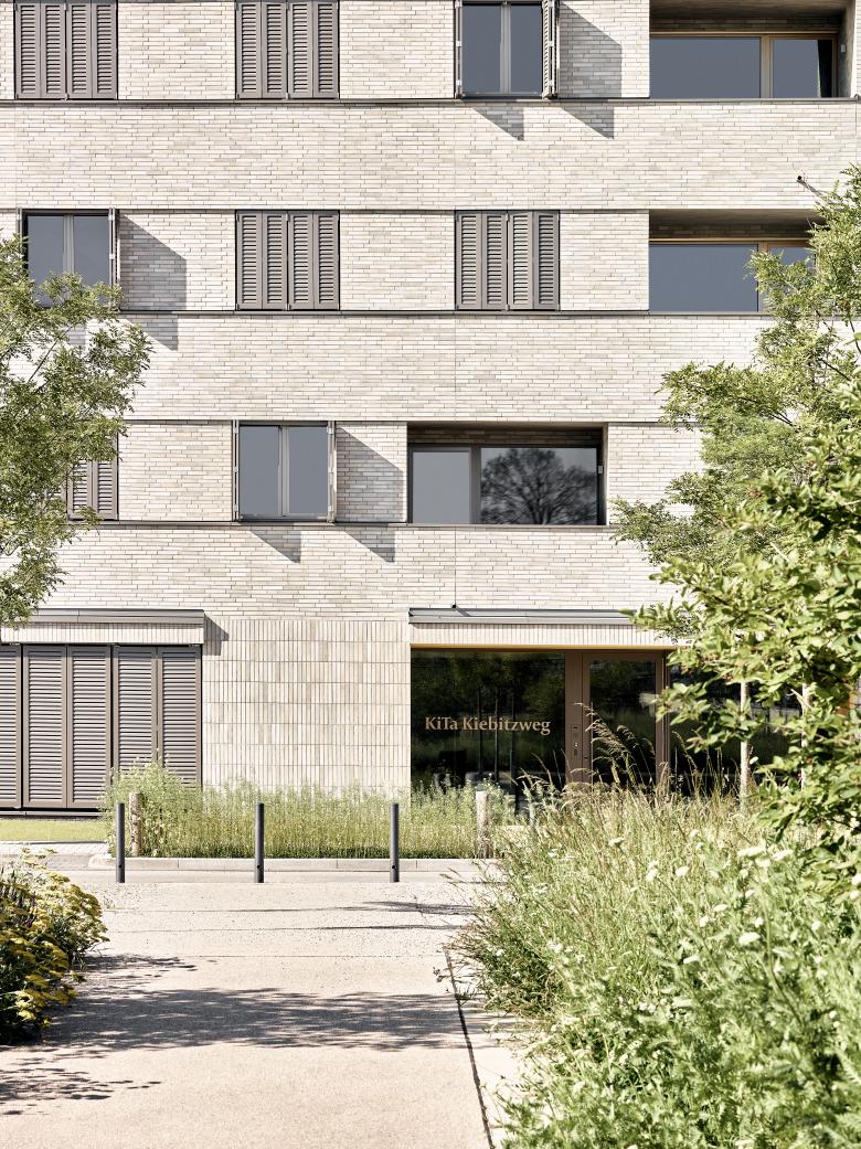 Für das Gebäude der südlichen Kindertagesstätte mit 31 geförderten Wohneinheiten wurde ein konkurrierendes Verfahren ausgelobt, welches Christ.Christ. für sich entscheiden konnte.