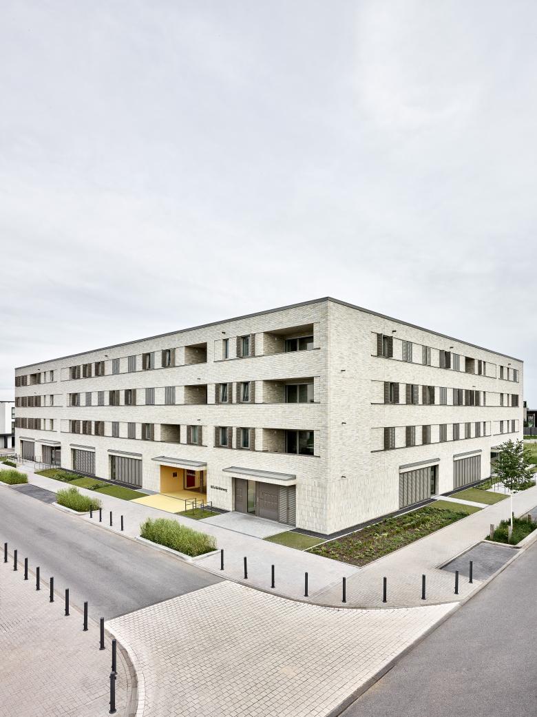 Die Nutzungsmischung des Gebäudes spiegelt sich gestalterisch in einem differenzierten Fassadenaufbau wider. Die Außenfassaden des Gebäudes werden mit gedämpften beige-braunen Riemchen verkleidet. Das durchlaufende Sockelgeschoss wird mit Grenadierschichten ausgebildet, und regelmäßig über die Fassade verteilte große Öffnungen strukturieren den Bereich der Eingänge und der Nutzungen für die Kindertagesstätte.