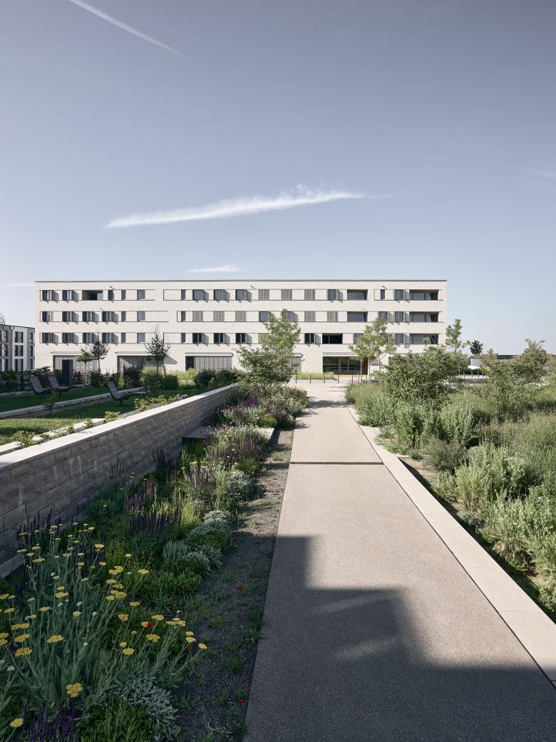 Das geplante Gebäude erfüllt seine Funktion als Platzkante und als südliche Einfassung des Quartierparks. Durch seine klare Kubatur und hochwertige Fassade werden ein städtebaulicher Identifikationspunkt und ein eindeutiges Pendant zu dem im Norden gelegenen Hainplatz gebildet.