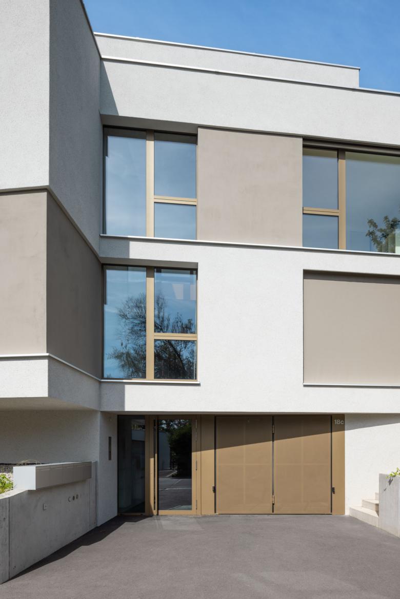 Die Materialisierung aussen unterstützt das volumetrische Konzept. Der Putz mit Terrazzo-Effekt verleiht den geschlossenen Wandoberflächen eine starke Plastizität. Die Fensteröffnungen der Hauptgeschosse sind zwar regelmässig gesetzt. Hingegen werden jeweils zwei Fenster mit farblich angepassten glatten Putzflächen zusammengefasst, wobei auch die Stoffstoren auf die Fensterfarbe abgestimmt sind. Die so generierten verschobenen Bänder betonen die Horizontalität und dynamisieren die Fassade.