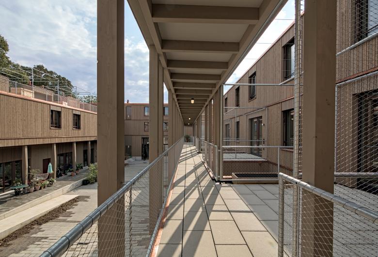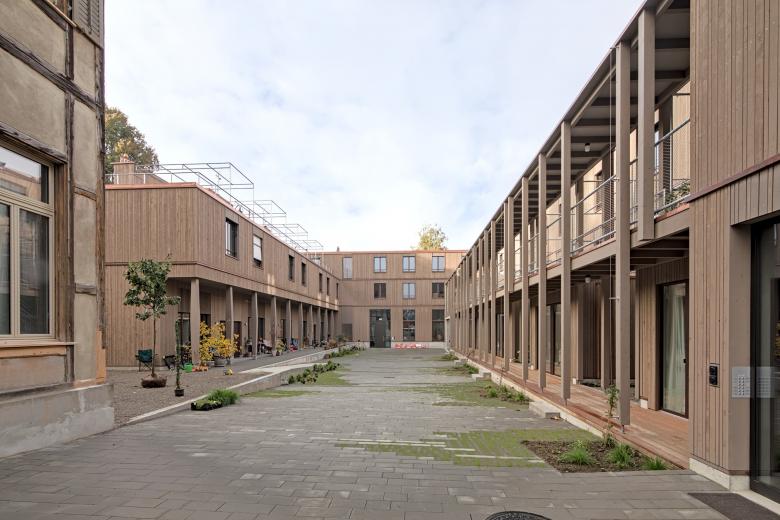 Von der alten Wagenfabrik wird der Kopfbau als Wagi-Haus erhalten. Zwei neue längliche Baukörper, das Lauben-Haus und das Dachgarten-Haus ergänzen es. Das Dachgarten-Haus übernimmt in seiner Längsausdehnung den Fussabdruck der alten Wagenfabrik. Mit seiner zurückhaltenden Höhenentwicklung und seiner aufgelösten Dachstruktur nimmt das Volumen Bezug auf die kleinteilige Bebauungstruktur der südlichen Nachbarschaft.
