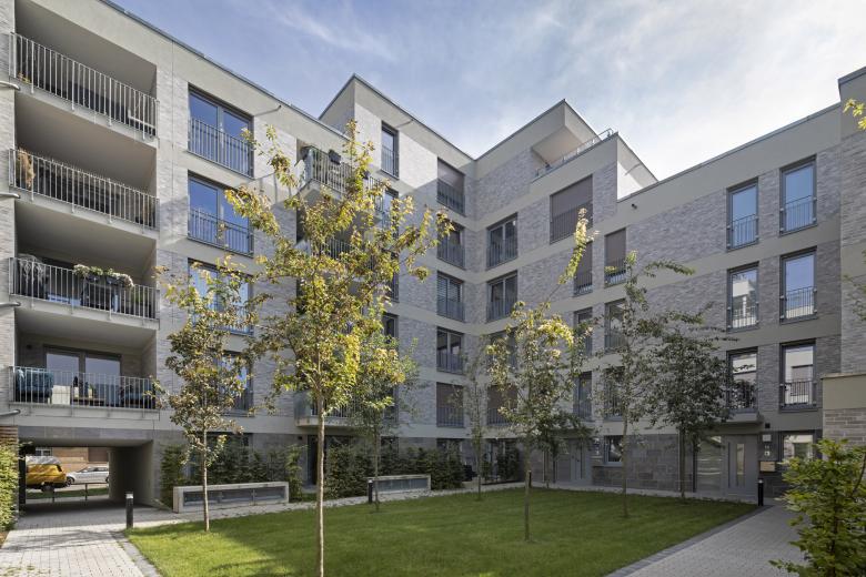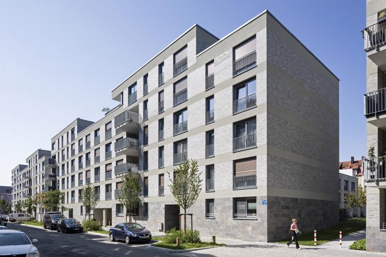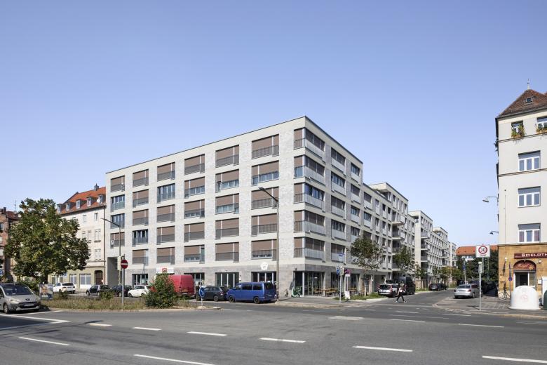 Der Bebauungsvorschlag schließt den bestehenden offenen Blockrand mit einem differenzierten Gebäudeensemble entlang der Fürther Straße, Spohrstraße und Fahrradstraße ab. Er bietet mit einer belebten Fassade eine Vorderseite zur Stadt. Das Gebäudeensemble besteht aus winkelförmigen Einzelgebäuden, die die straßenbegleitende Bebauung aufgreifen und sich im Innenhofbereich fortsetzen. Die Gebäudehöhen werden entsprechend der jeweiligen städtebaulichen Situation moduliert: sechsgeschossig als Hochpunkt an der Hauptstraße, fünfgeschossig im Maßstab der gegenüberliegenden Bebauung entlang der Nebenstraßen, sowie drei- bis viergeschossig im Innenbereich. So entsteht eine gegliederte Gesamtvolumetrie, die sich in die Körnung der Umgebung optimal einfügt. Die einzelnen Gebäude sind durch leicht unterschiedlich artikulierte Fassaden voneinander abgesetzt, bilden aber durch eine ähnliche formale Gestaltung einen zusammenhängenden Gebäudekomplex mit einer Differenzierung von außen (Stadt) und innen (grüner Hof). Durch diese leichte Differenzierung greifen sie das Thema des parzellierten Städtebaus der Umgebung auf.
