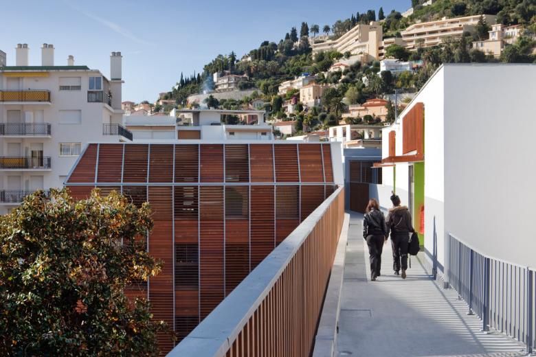 Ainsi, fort de cette contradiction, notre objectif premier a été celui de constituer une unité au site que nous avons retranscrit par une continuité spatiale - de par la nécessaire connexion des bâtiments entre eux, et ceci malgré les fortes différences altimétriques d’implantation - mais aussi continuité visuelle, afin d’offrir une véritable identité à cet établissement. Une peau unique et identitaire constituée de brise soleil en bois, vient tel un voile protecteur envelopper à la fois les bâtiments existants et les nouvelles constructions.
