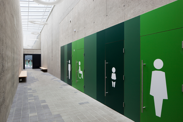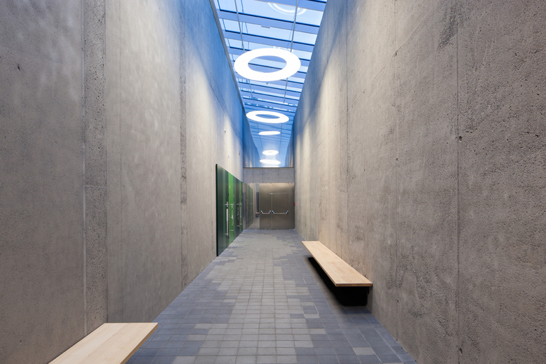 While the originally closed facade of the long main building was replaced by a large glass front, the building’s geometry has been simplified in order to place a stronger emphasis on the entrance area. By harmoniously integrating the already existing, frontally situated parking area, visitors now have short, safe ways to the entrance.
