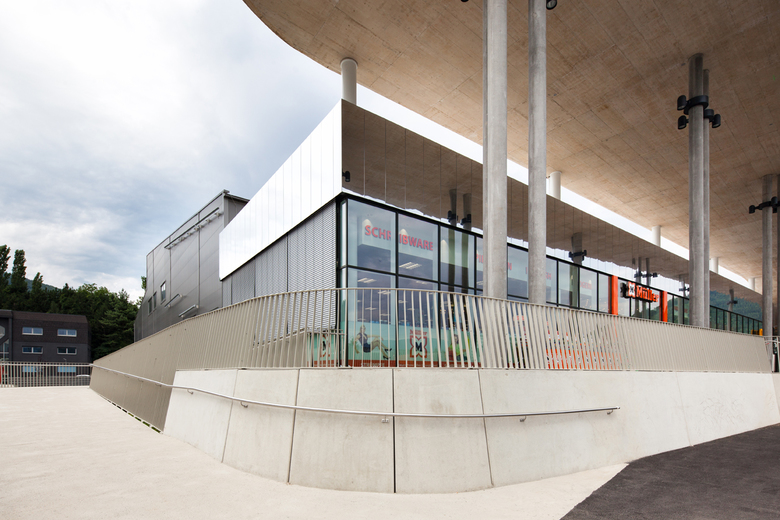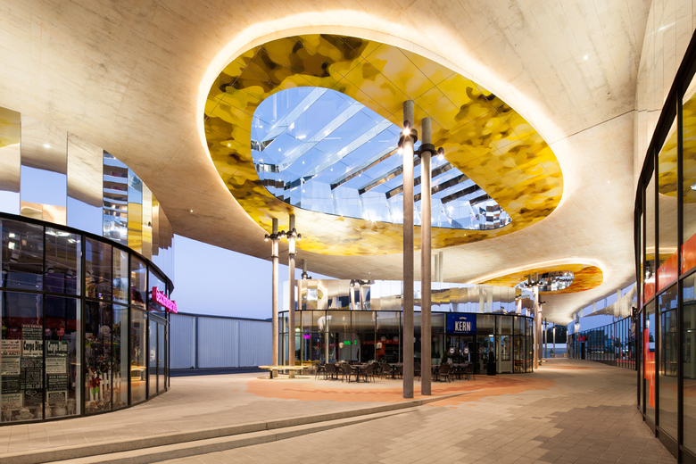 Two pavilions (retail and gastronomy) are connected to the main building by one roof to form a unique structure, a canopy, which is almost 10 meters high. This is built on reinforced concrete stilts, that seem randomly arranged to create a playful and light space. The effect is underlined by a glazed, asymmetrical and circular roof opening which allows natural light into the seating areas on the curved and colourful paved promenade.
