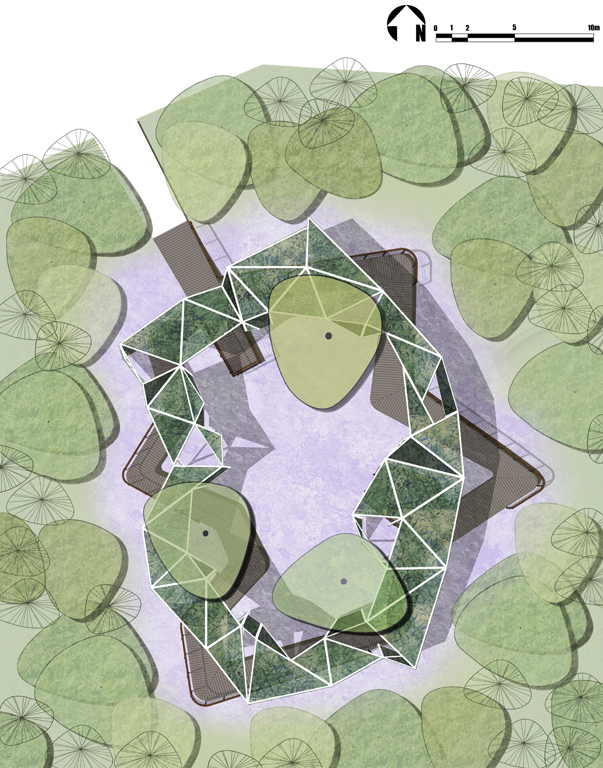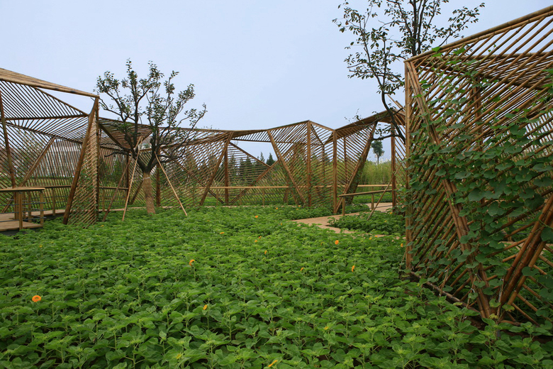Besides being a horticulture activity, garden is also a kind of art, a space art. In Happy Garden, a wooden boardwalk winds through an irregular gourd-crawling treillage built with bamboo. Walking on this zigzag boardwalk, visitors can experience unpredictable spatial and visual variation, inside and outside, high and low, brightness and darkness,open and closed. This responds to the space characteristics of Chinese traditional garden.