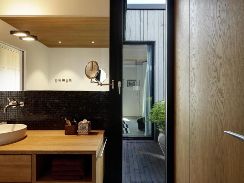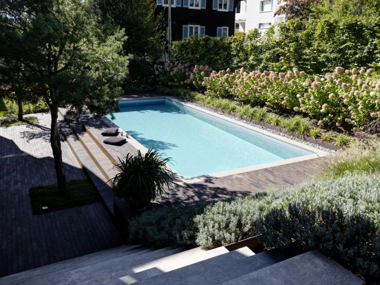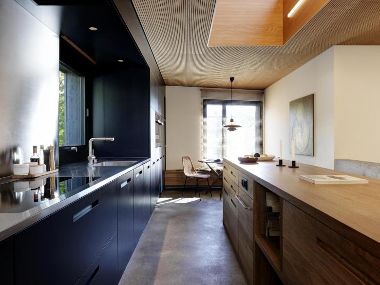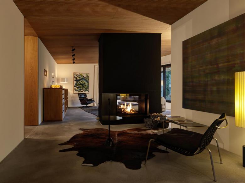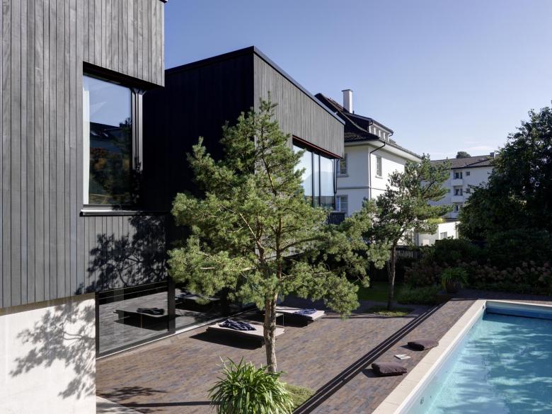 Der zweigeschossige flache und ausladende Neubau ist sensibel in das gewachsene Quartier eingebettet. Die Materialisierung und das Konstruktionskonzept lehnt sich an die umliegenden Chaletbauten an, welche jeweils mit einem massiven Sockel und einem darüberliegenden Holzbau konzipiert sind. Tiefe Einschnitte in den Fassaden und markante Dachaufbauten dienen zur zusätzlichen Belichtung des Grundrisses und sind prägende Elemente des Entwurfes. Unter den teilweise imposanten Auskragungen entstehen grosszügige und geschützte Aussenräume. Das Material- und Farbspektrum beschränkt sich in der Hauptsache auf Sichtbeton, schwarz eingefärbten Holzriemen aussen und Eichenholz im Innern. Einzig die in dunkelrot gehaltenen Beschattungsmarkiesen bilden einen Farbakzent.
