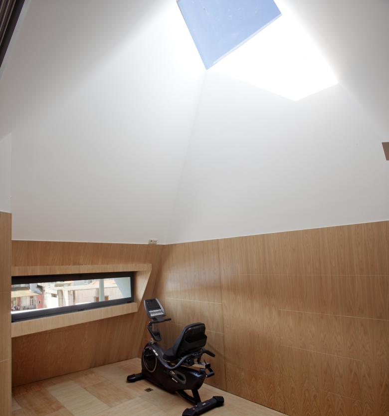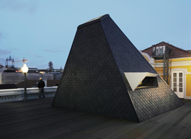 This new volume is seen as a “container”, a hermetic box. It is torn at certain points, creating a game of light and shadow which determines the interior path. The building’s programme only includes two compartments which support the activities on the rooftop. At the construction level, a wooden structure has its interior covered in gypsum board and slate, in fish scale format, in the outside.