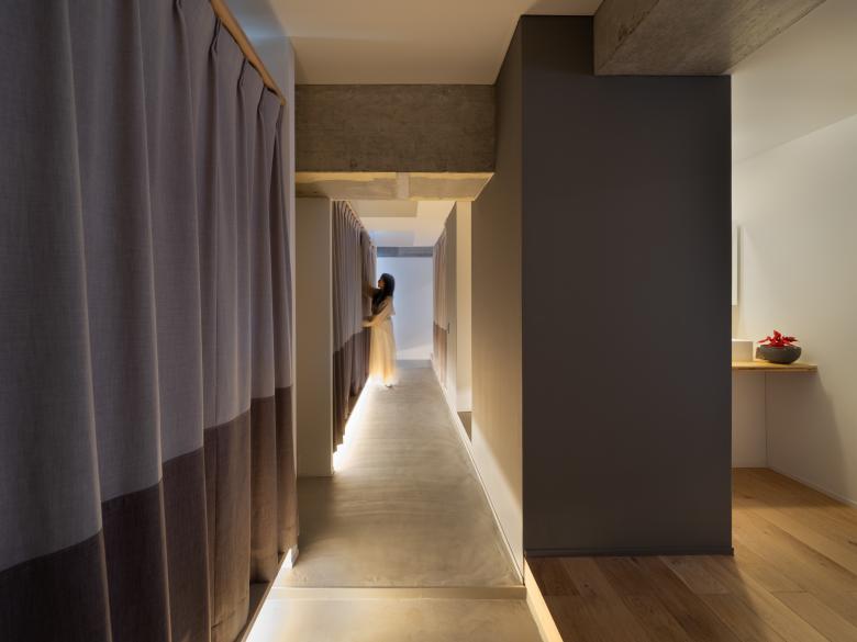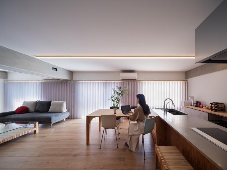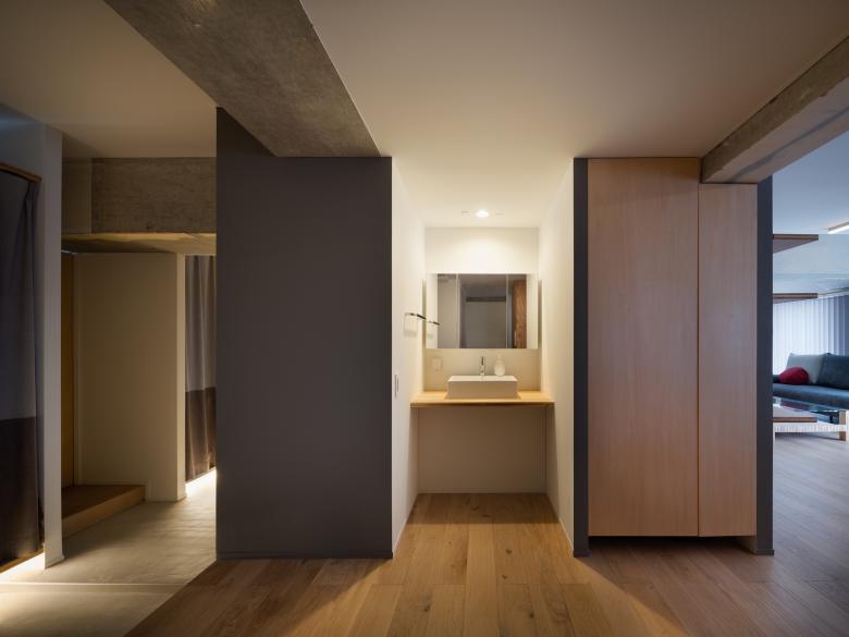 First, we dismantled all the walls of the small rooms and placed the water area in the center of the rooms so that the residents could move freely around it. The Doma is pulled in from the entrance to the back of the room, softly separating the areas of public and private space. This Doma also functions as a line of flow. On the south side of the divided area, a large living space and dining kitchen are placed, and on the north side, a workroom and bedroom are placed so that the residents can concentrate on their work.