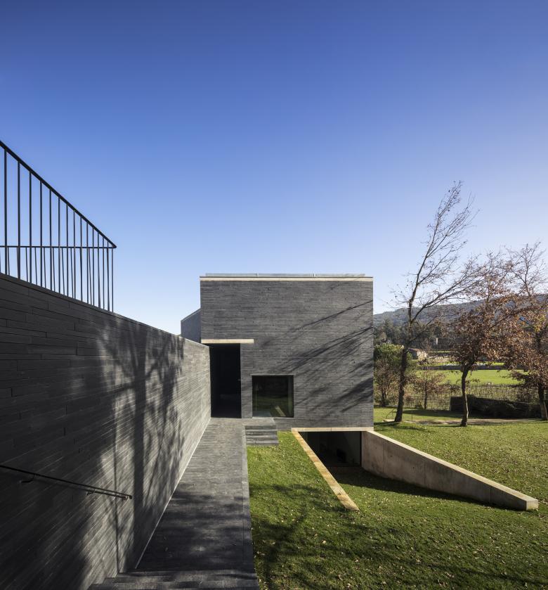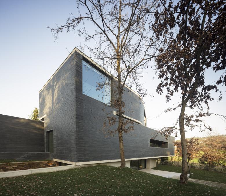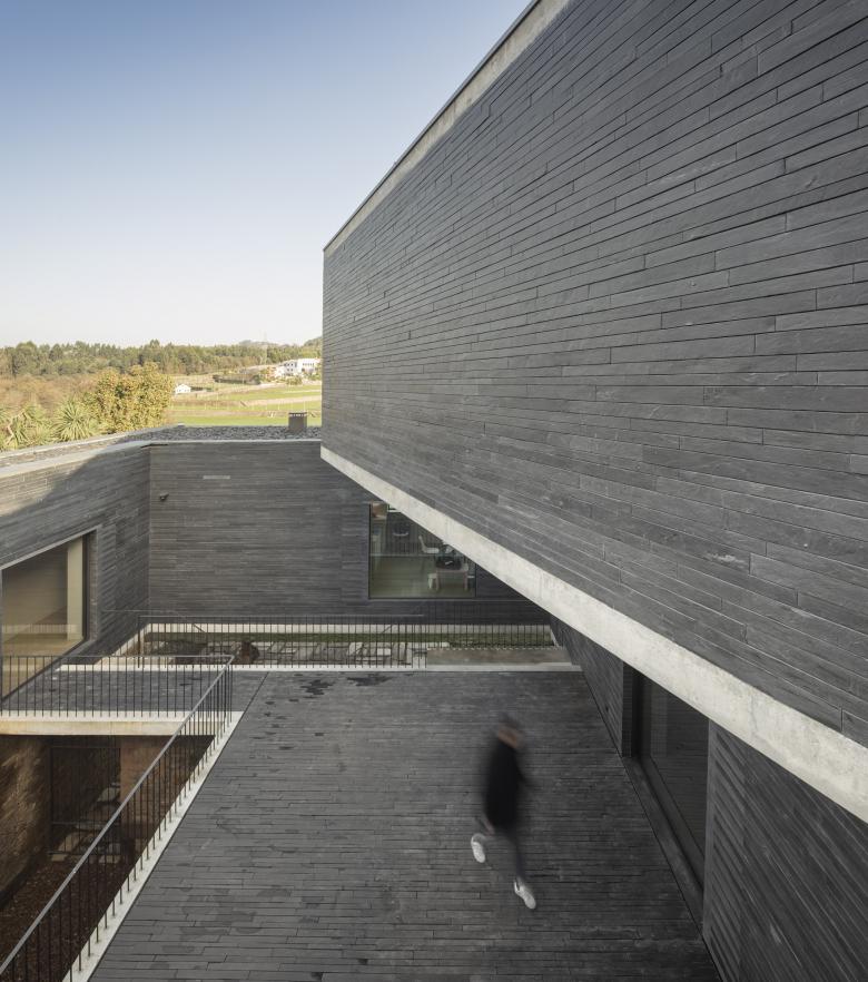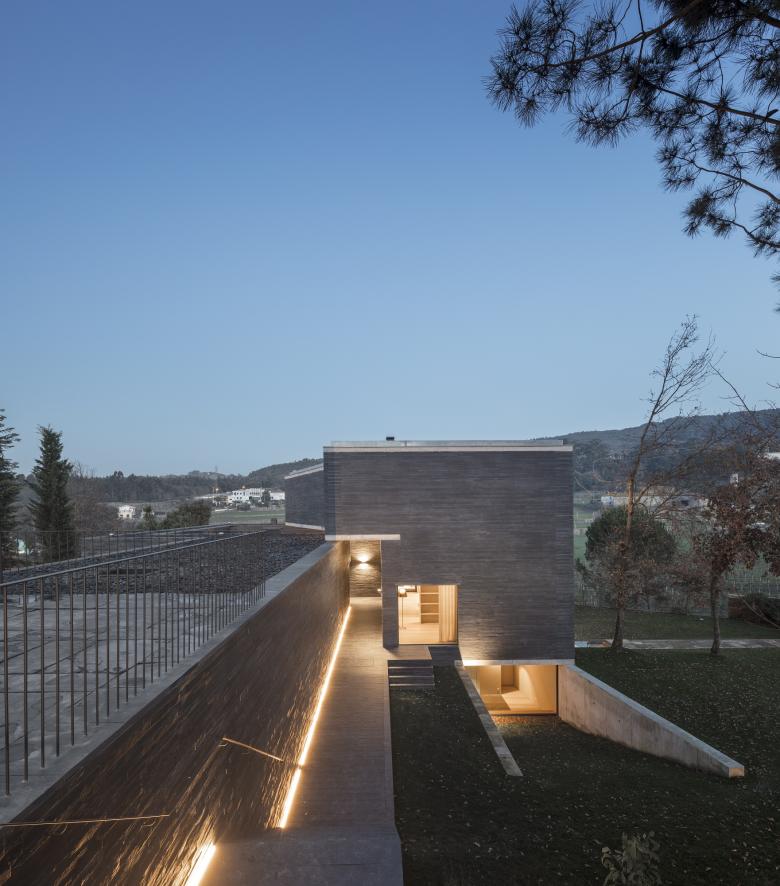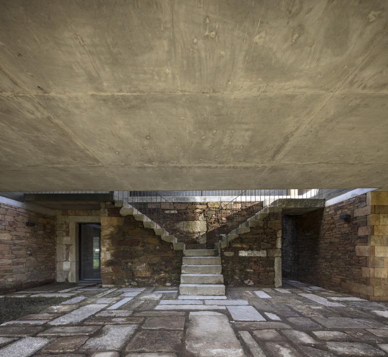 The new construction, (completely made or reinforced concrete) is a dark mass of slate sitting on the lower walls of the old house made of schist blocks against the old terraces of granite and schist.