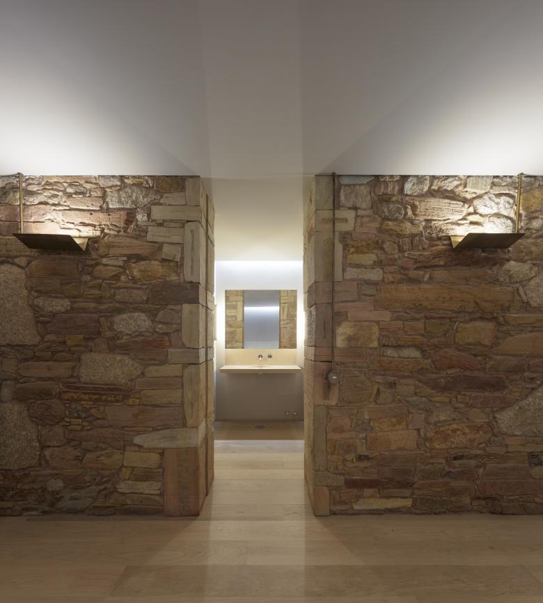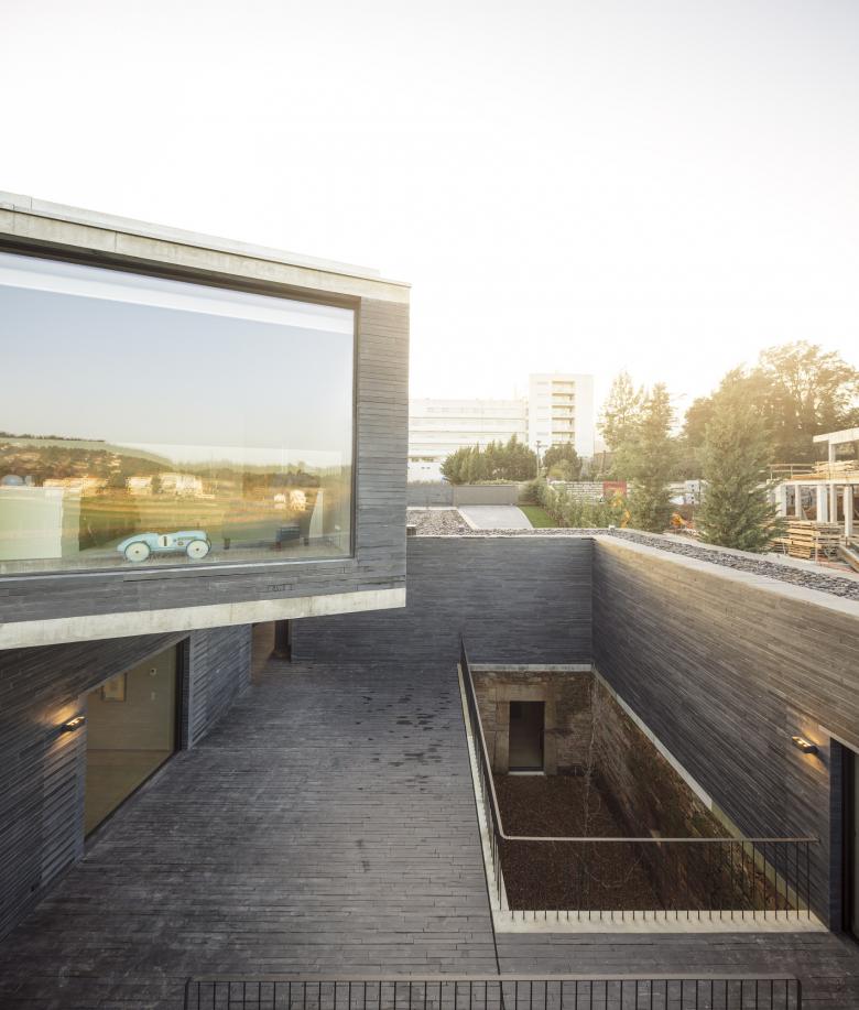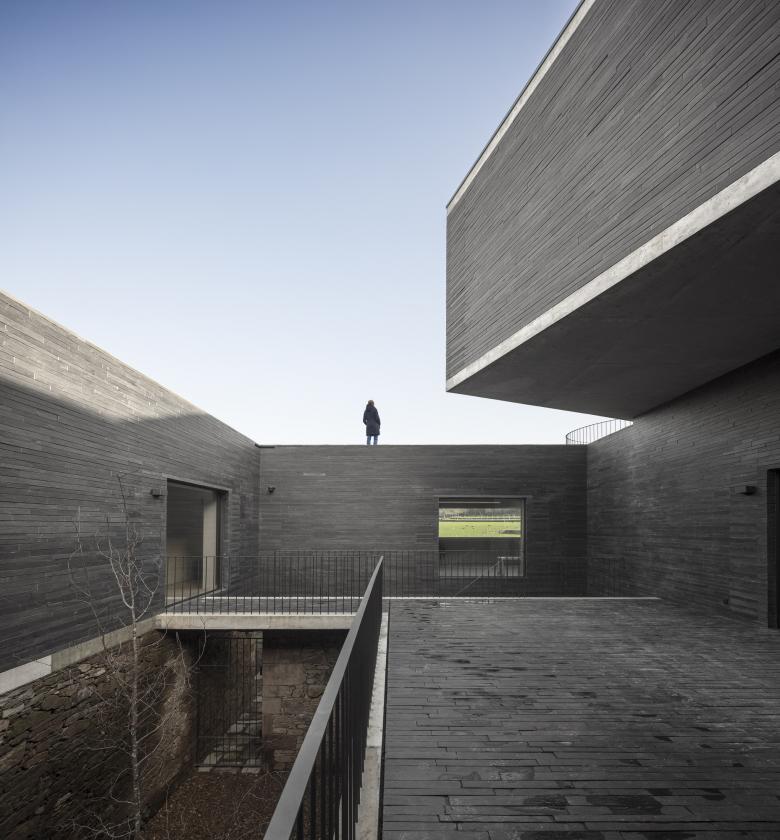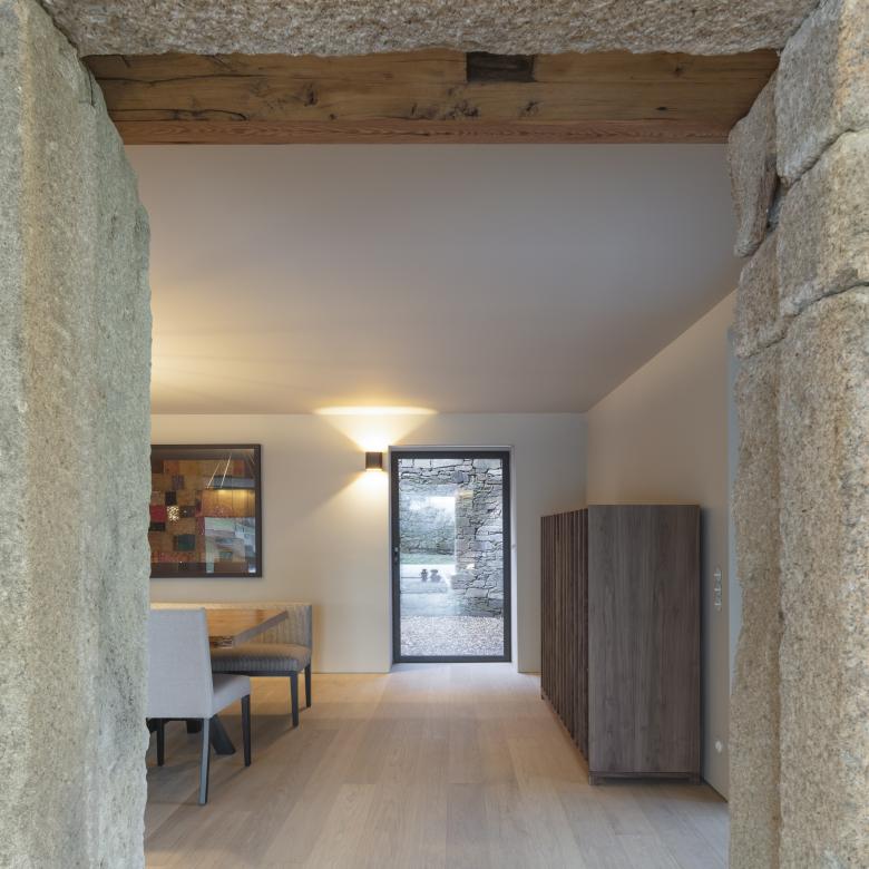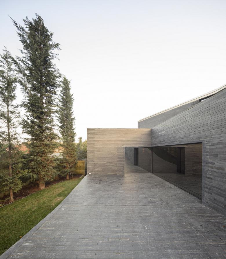 The new construction, (completely made or reinforced concrete) is a dark mass of slate sitting on the lower walls of the old house made of schist blocks against the old terraces of granite and schist.