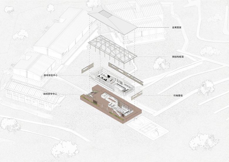 The Coffee Research and Learning Center, serving as a gateway building that integrates the primary, secondary, and tertiary sectors of the coffee industry, is located at the main entrance where the village's residential area meets the factory. The project aims to create a place for people to rest and sightsee, popularize coffee - related knowledge, offer coffee experiences, and conduct coffee culture exchanges. Meanwhile, it provides coffee - industry - related training (such as picking, roasting, and brewing) for local ethnic minority villagers and outsiders interested in coffee. To some extent, it also supplements the village's public supporting infrastructure (community library, restrooms, etc.).