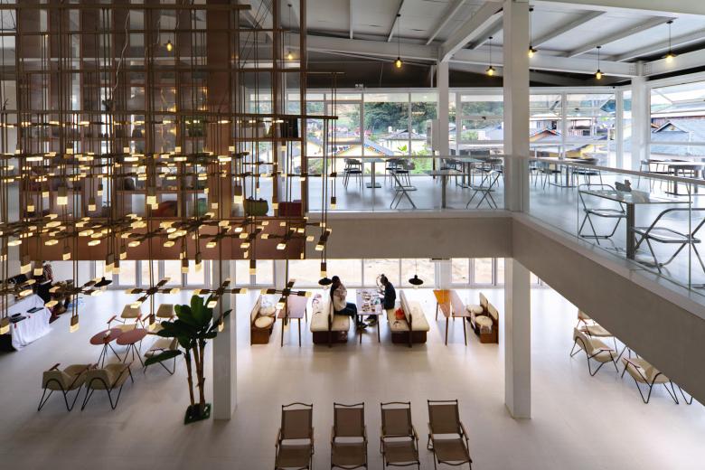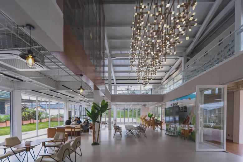 On the second floor, an industrial dialogue is created through a double landscape terrace. One facing the factory area and plantation, and the other facing the main road into the village. These terraces are accessible via outdoor stairs on both sides. The indoor space is designed with flexible partitions and divided into various experience spaces by different forms of tables and chairs.