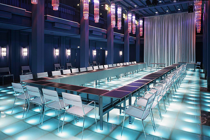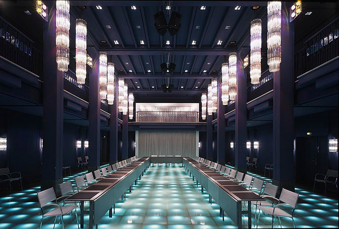 In dem Bestreben Spuren ehemaliger DDR Innenarchitektur im Ganzen zu erhalten, tauchten wir den Saal komplett in eine blau-graue Farbe und legitimierten mit diesem Gestaltungs-Konzept seine Konservierung. Entsprechend der jetzt neuen, politisch „transparenten“ Ebene, gaben wir ihm mit dem beleuchteten Glasboden die neue Basis.
