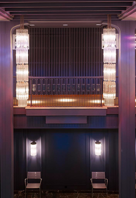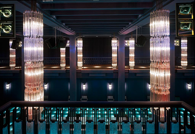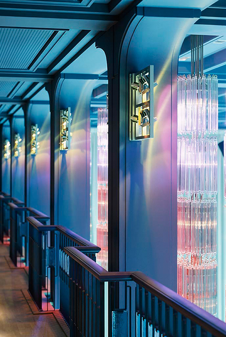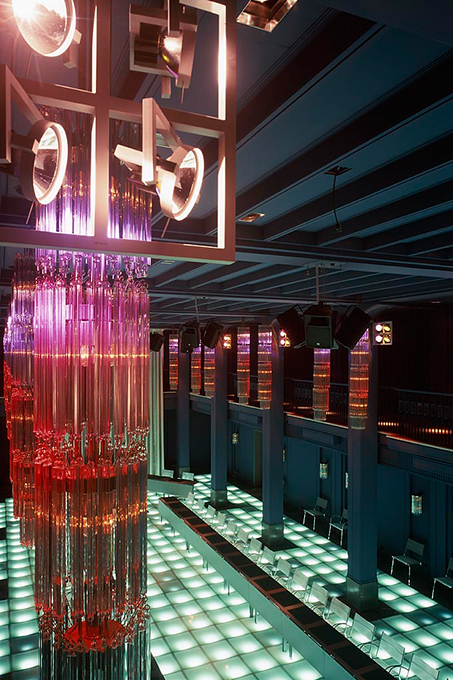 Die ehemaligen Kristallüster werden heute zur Skulptur - durch innen liegendes Farblicht und äußere Lichtinszenierung mit Strahlern.