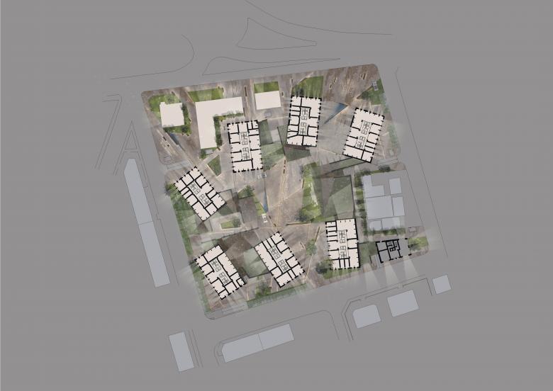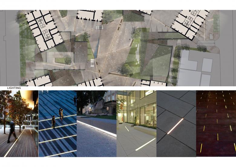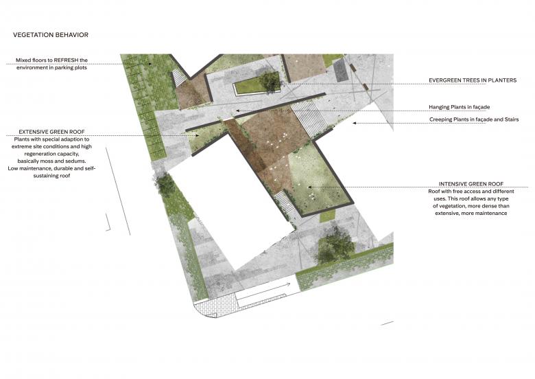 Partim de la idea dels edificis dels quals els eixos estan girats per a aconseguir que tots mirin a la mar. Aquests eixos resultants defineixen uns patrons d'ordre en la plaça on aquestes línies creen una fusió amb l'arquitectura en diferents nivells: paviments, limitis, mobiliari, vegetació local i presència del sòl.