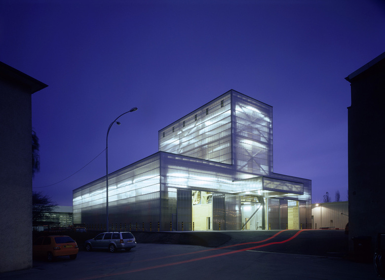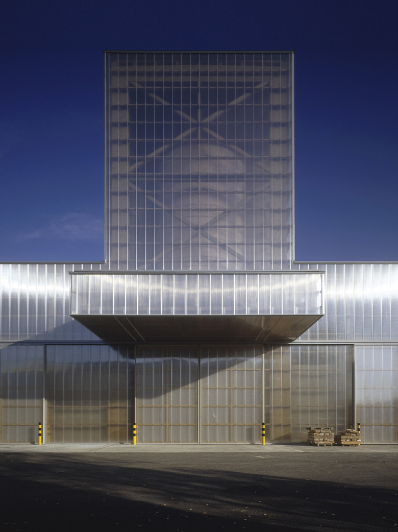 This form of translucent cladding means that what are otherwise hermetically sealed buildings in use for only a few weeks in the year can appear full of life and insubstantial. Seen from a certain distance, it takes on the colour of the sky, whereas from close by it either reflects the immediate environment or reveals the inside of the building, depending on the position of the sun. At night, it takes on a crystalline form and glows like a giant lanter.
