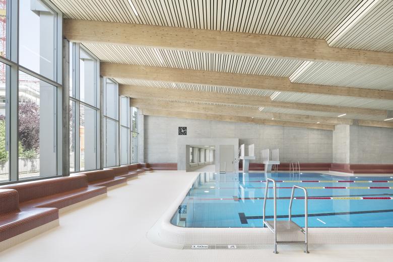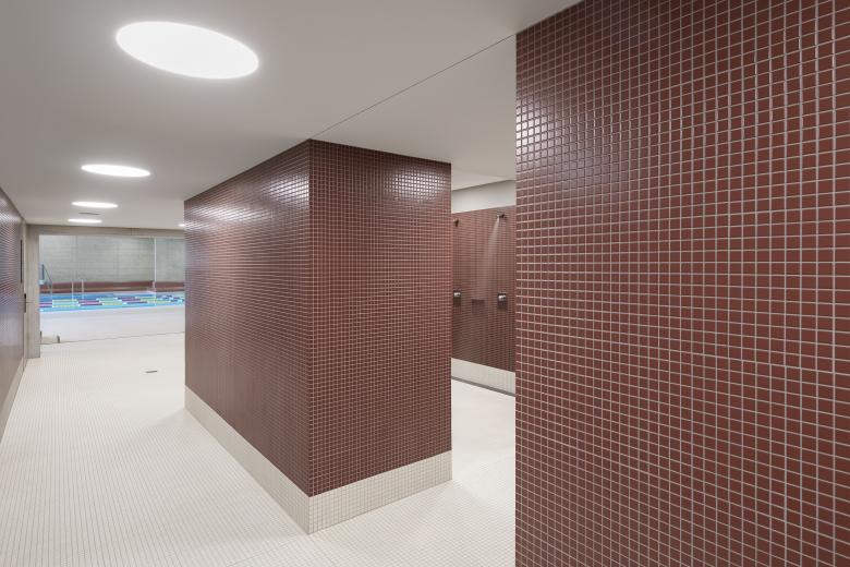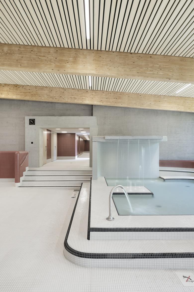 Der Fokus der rücksichtsvollen und gesamtheitlich gedachten Sanierung im Innenraum lag auf der Erhaltung der vorhandenen architektonischen Qualitäten durch kaum wahrnehmbaren Ergänzungen. Die Gestaltungsmerkmale des Bestands, wie die ansteigende Holzdecke, die grossflächige Verglasung, die zeittypischen Beckenränder und Sitzbänke entlang der Aussenwände sowie auch die unterschiedlichen Niveaus der Anlagen wurden während der Sanierung herausgestellt und harmonieren mit den neuen Eingriffen.