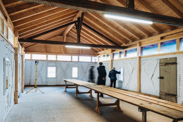 Die Remise steht als Nebengebäude durch ihre Funktion und ihre Lage im Schatten der historischen Villa. Bei der Erstbesichtigung 2020 wurde das Objekt in einem sehr verwunschenen, desolaten und tw. einsturzgefährdeten Zustand vorgefunden. Die Zukunft des Hauses war unsicher und fragwürdig. Diese Situation hat das Gebäude bei zurückliegenden Umbaumaßnahmen aus dem Betrachtungsfokus gerückt. Die Eigentümerfamilien konzentrierten sich mit ihren Investitionen nachvollziehbarerweise auf Wohnnutzung und Hauptgebäude.