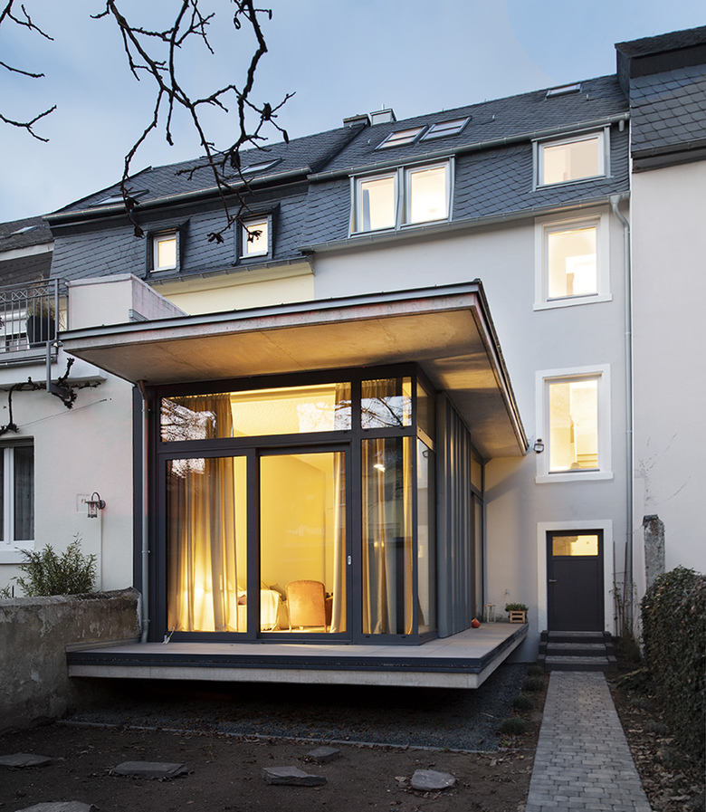 Im Erdgeschoss wurde der offene Küchen- /Ess- / Wohnbereich um einen Anbau mit Süd-West-Orientierung Richtung Garten erweitert, der von einem alten Nussbaum geprägt wird. Großformatige Schiebetüren sowie eine umlaufende Terrasse schaffen einen nahtlosen Übergang zwischen innen und außen. Das Flachdach des Anbaus kann zukünftig auch als Dachterrasse genutzt werden.