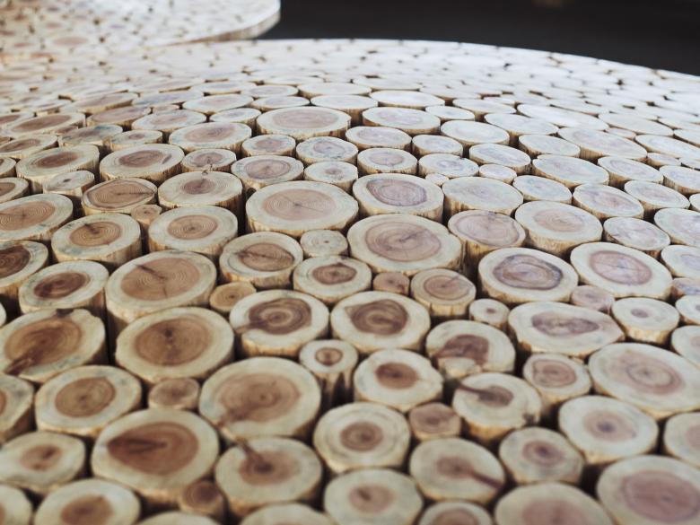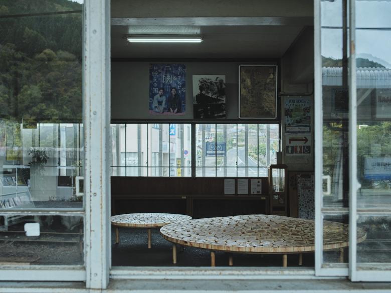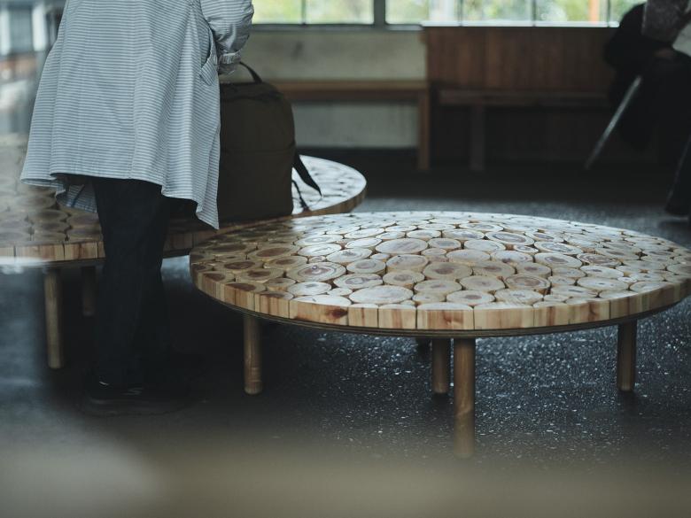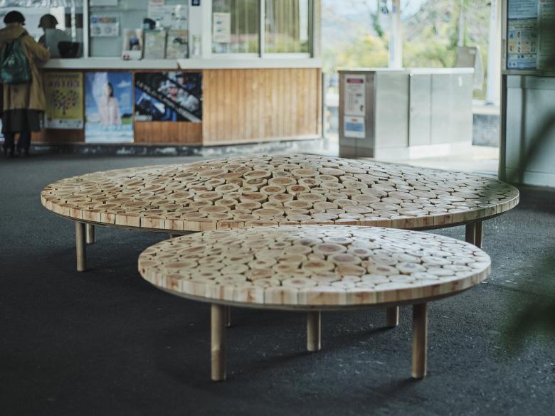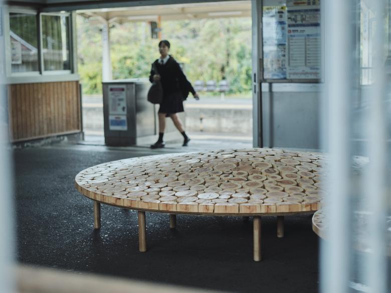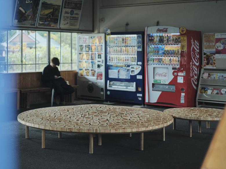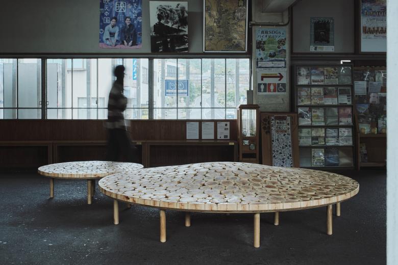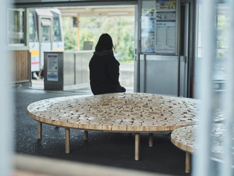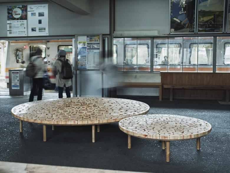2024年 岡山「森の芸術祭」に合わせ、中国勝山駅に計画した円形のベンチ。真庭市の林地残材(未利用木材)でつくった。サイズや年輪が異なるたくさんの木材を敷き詰め、それらを削って緩やかな起伏をつけた。岡山の山々のような柔らかなシルエットをもち、あるいは人間と自然が交わる里山をイメージするような、この場所の風土を感じられるベンチを目指した。
