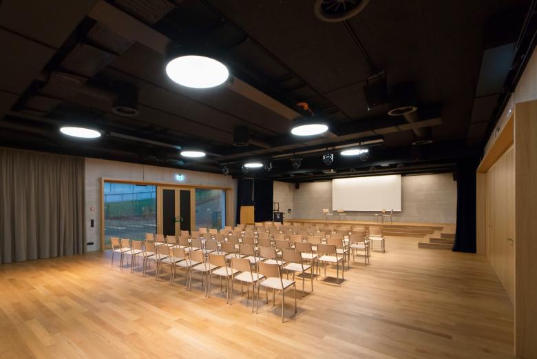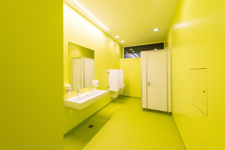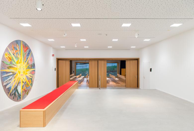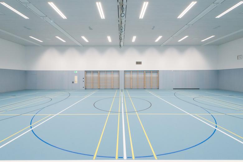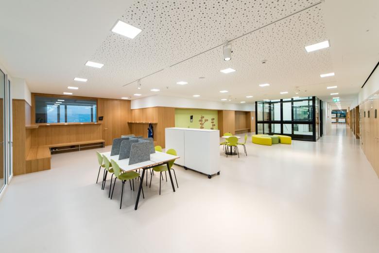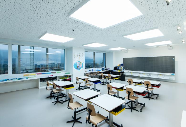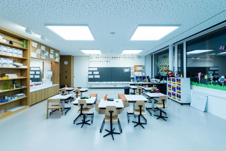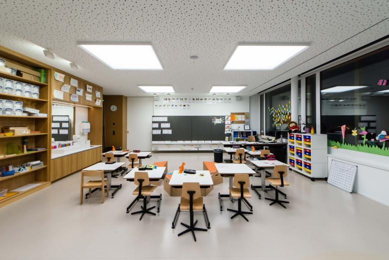 Flächige Leuchten in den Unterrichtsräumen sind mit Tunable-White LED ausgerüstet und in Abstimmung auf die Veränderungen im Tageslicht programmiert; so kann der Biorhythmus unterstützt und positiv beeinflusst werden.