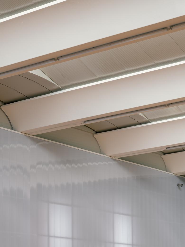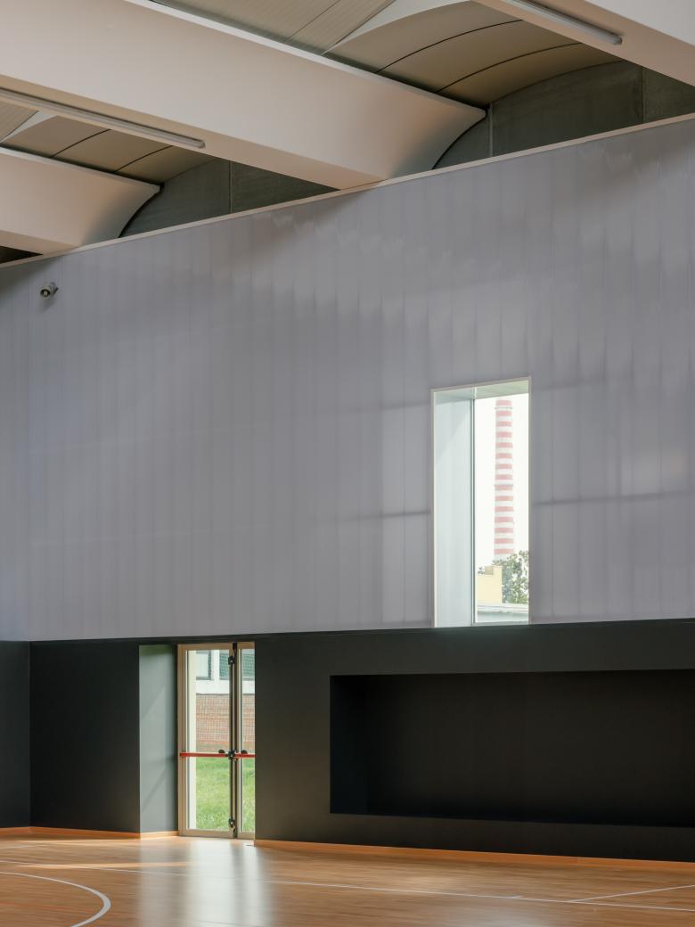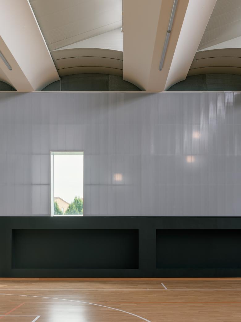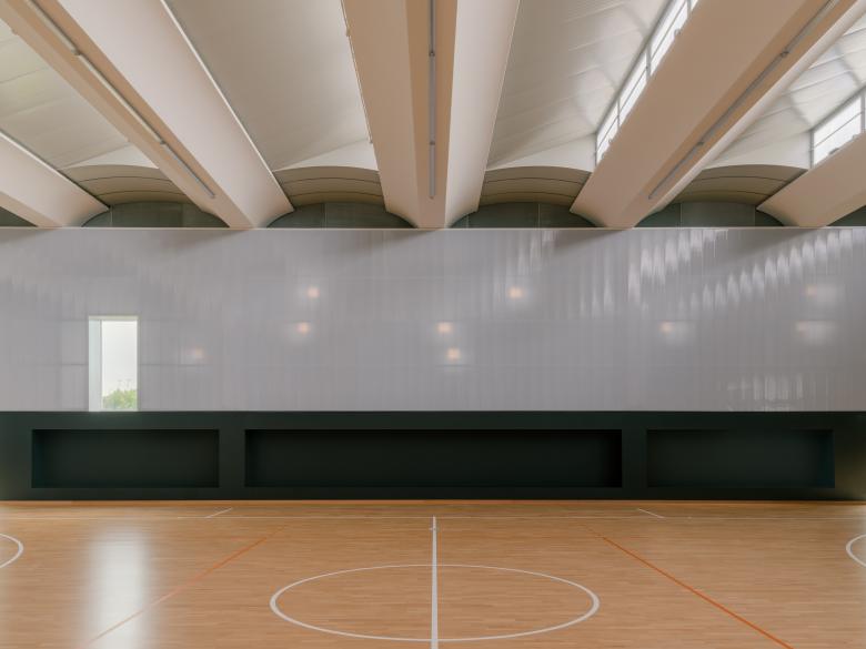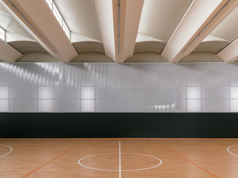 Inside, zenithal light coming from the north ensures uniform illumination of the space, while the openings along the longitudinal sides are shielded with polycarbonate walls that filter out direct sunlight from the playing field.