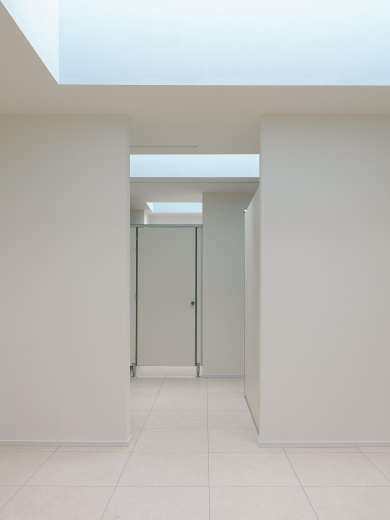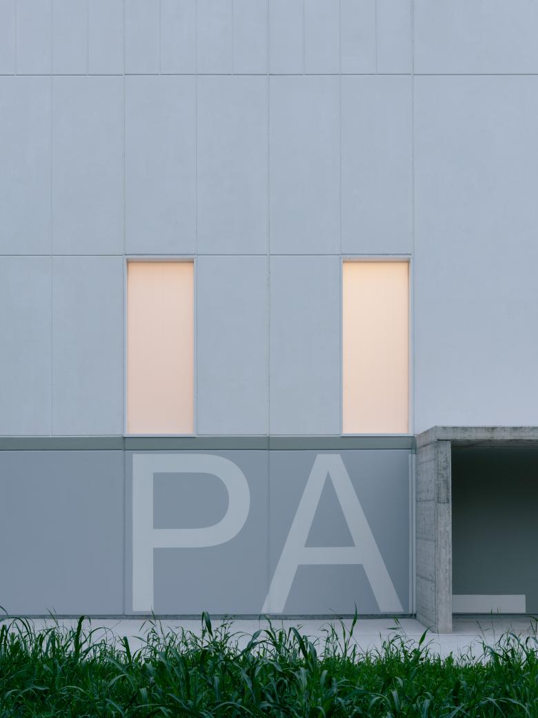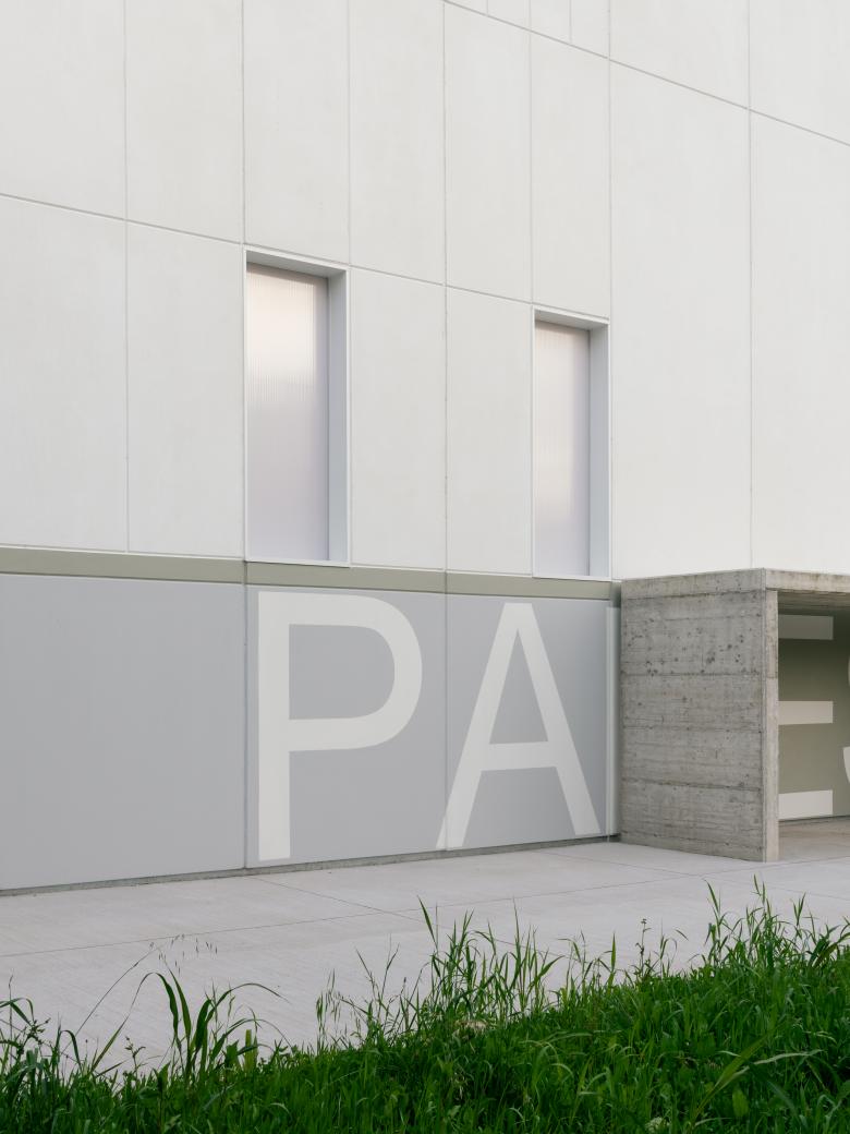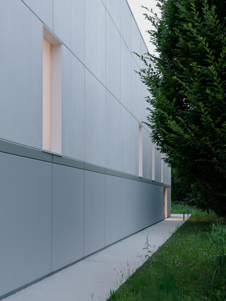 On the shorter side, a gradual abstraction of the façade elements occurs, culminating in the elevation facing the green system, where small irregular openings dematerialize the façade—except for one large selective opening oriented towards two symbolic landmarks of the community: the bell tower and the chimney.