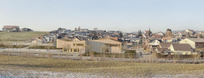 Das Terrain für das neue Schulhausgebäude mit fünf Klassenzimmern für die Unterstufe und zwei Kindergärten liegt in der Talebene in unmittelbarer Nähe des Dorfbaches la Sionge. Mit der aufgelösten Dachgeometrie integriert sich unser Projektvorschlag in die kleinteilige Quartierstruktur der Nachbarschaft, unterstreicht aber gleichzeitig den repräsentativen Charakter eines Schulgebäudes.