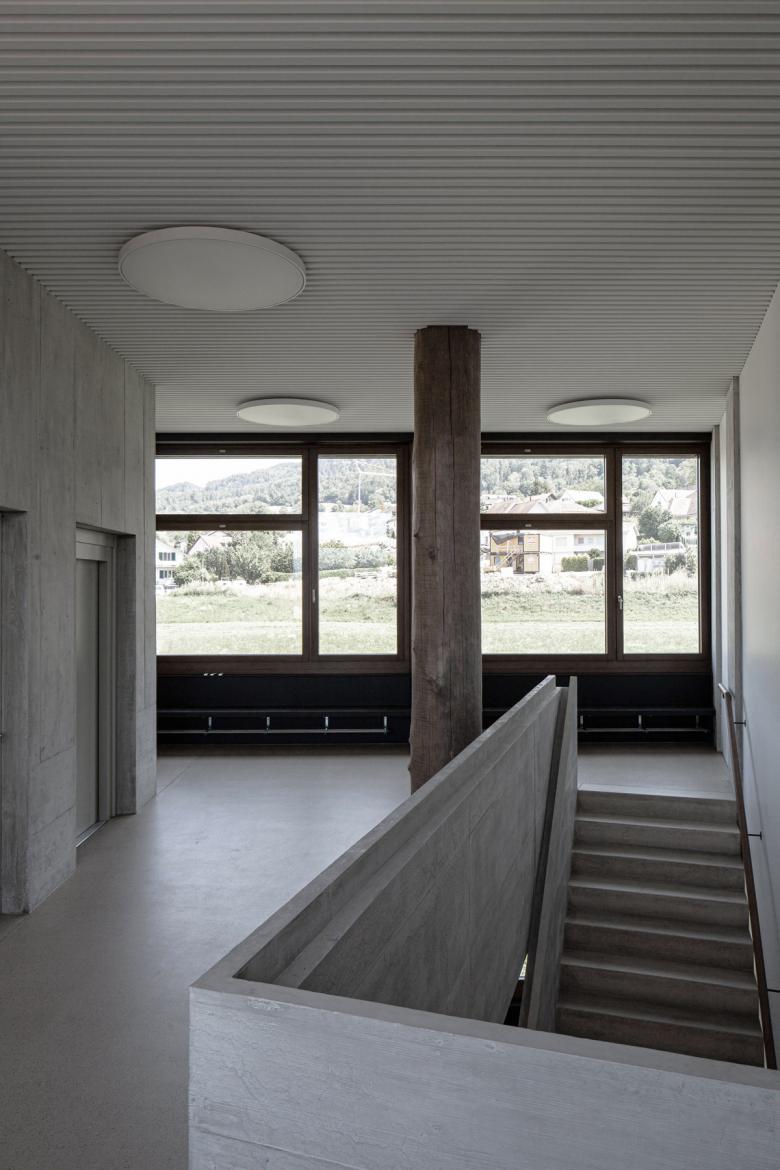 Der Erweiterungsbau oszilliert zwischen Auftakt und Schlussstein. Mit der Übernahme des Rhythmus der bestehenden Schule gliedert sich der Neubau harmonisch in das Konglomerat ein. Erschlossen sind die zeitgenössischen Lernlandschafen über einen gedeckten Aussenbereich, den gemeinsamen Eingangsbereich sowie über eine Treppenanlage und die Horizontal-Erschliessung der Klassenzimmer im Obergeschoss. Die Grundriss-Typologie der Erweiterung basiert auf dem geschossweisen Stapeln eines Schul-Clusters mit Klassenzimmer, abtrennbarem Gruppenraum, Vorzone, Garderobe und WC-Anlagen. Die Unterteilung von Klassenzimmer und Gruppenraum erfolgt über Glasschiebelemente und Vorhänge, somit ist eine störungsfreie Parallelnutzung beider Räume möglich.
