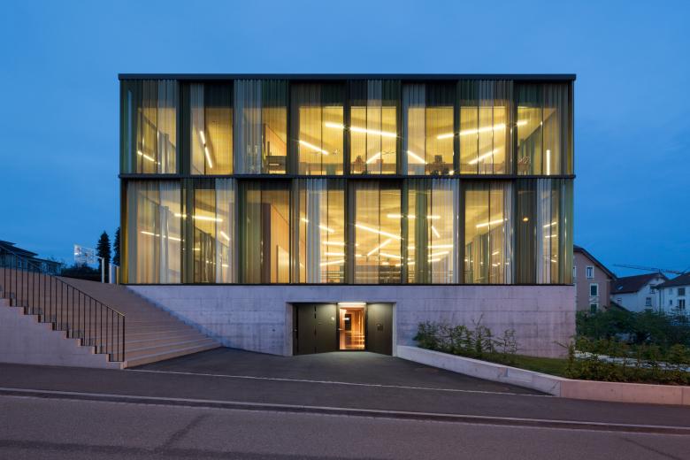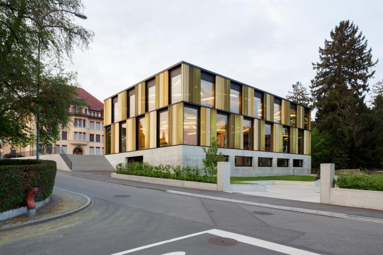 Der Ergänzungsbau bildet zusammen mit dem altehrwürdigen Hauptbau und dem Pausendach den neuen Schulplatz. Dieser wird somit neu zum Mittelpunkt der Schulanlage. Mit seiner moderaten Höhe ordnet sich das Gebäude dem Altbau unter und erreicht gleichzeitig eine harmonische Einfügung ins umgebende hochwertige Villenquartier des frühen 20. Jahrhunderts.