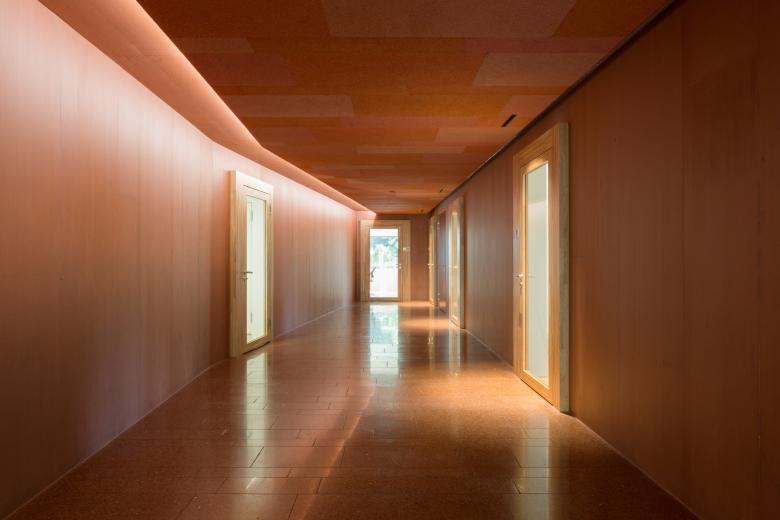 Unter Ausnützung der Hanglage konnte eine klare Aufteilung und Orientierung der verschiedenen neue Bereiche geschaffen werden. Während die Büros der Schulverwaltung direkt von der Strasse her erreicht werden, sind die Schulräume (Mehrzweckraum, Schulküche, Werkräume, Informatikraum, Aufenthaltsbereich) darüber vom Pausenplatz her erschlossen. Mit der freien Anordnung der Nebenraum-Volumen werden im Schulbereich offene Grundrisse mit Atelieratmosphäre geschaffen.