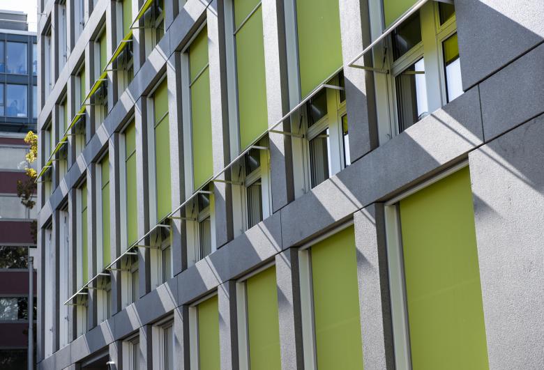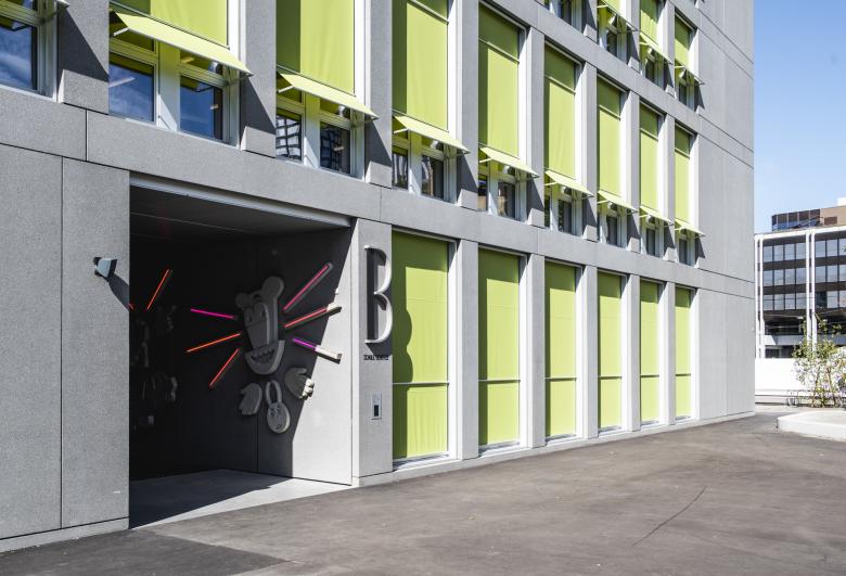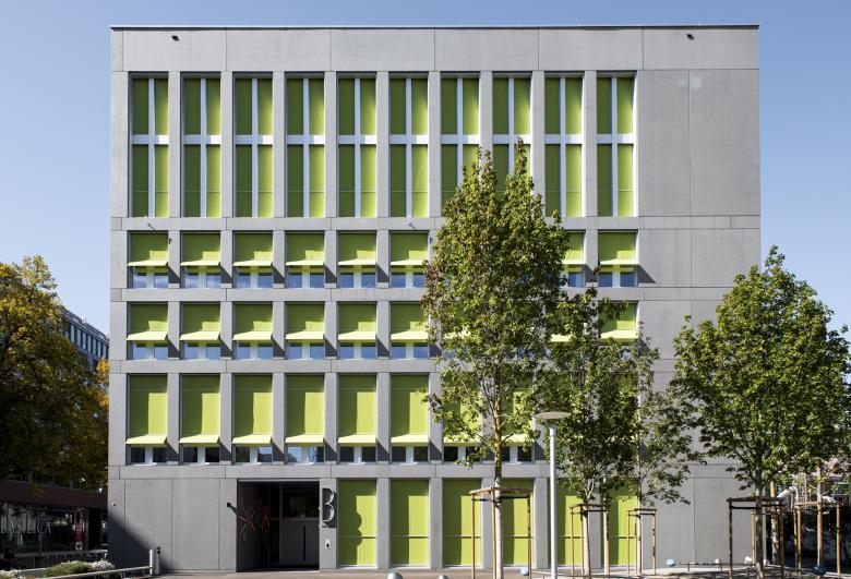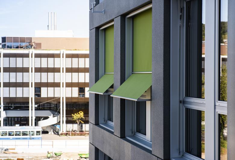 Im Schütze Areal wird fleissig gelernt. Und es lernt sich leichter, wenn das Raumklima angenehm ist. Die Vertikalstoren in natürlichem Grünton tragen massgeblich dazu bei. In den oberen und unteren Geschossen hat Kästli Storen über vier Meter hohe Storen entwickelt, die dank mitlaufenden Windstabilisationsrohren und beschwerter Fallstange hohen Windgeschwindigkeiten standhalten. Auch die in den mittleren Geschossen montierten windstabilen Ausstellstoren mit Gasdruckelementen wurden in filigraner Machart in der Belper Manufaktur fabriziert.
